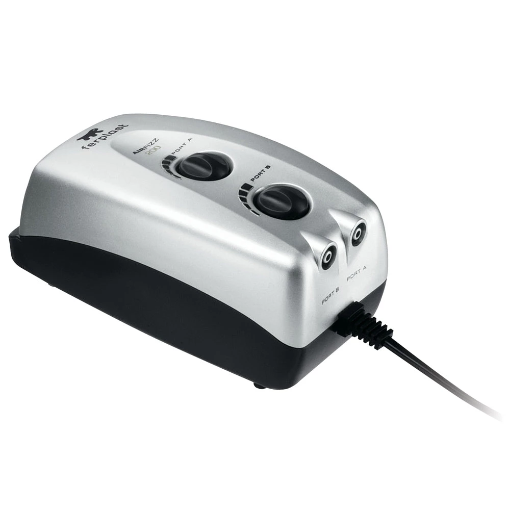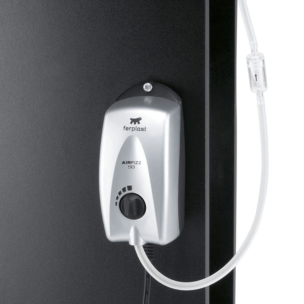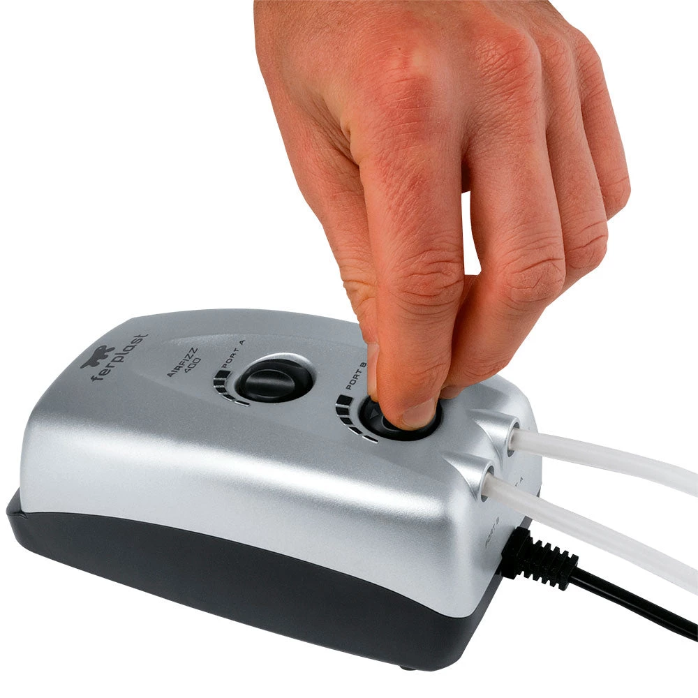 Erhältlich in vier Modellen haben Aquarium Luftpumpen Airfizz ein oder zwei Ausgangsdüsen mit verstellbarem Durchfluss: eine Düse in den kleineren Modellen Airfizz 50 und 100, zwei Düsen in den Modellen Airfizz 200 und 400. Praktische Gummifüße am Boden verringern die Vibration.
