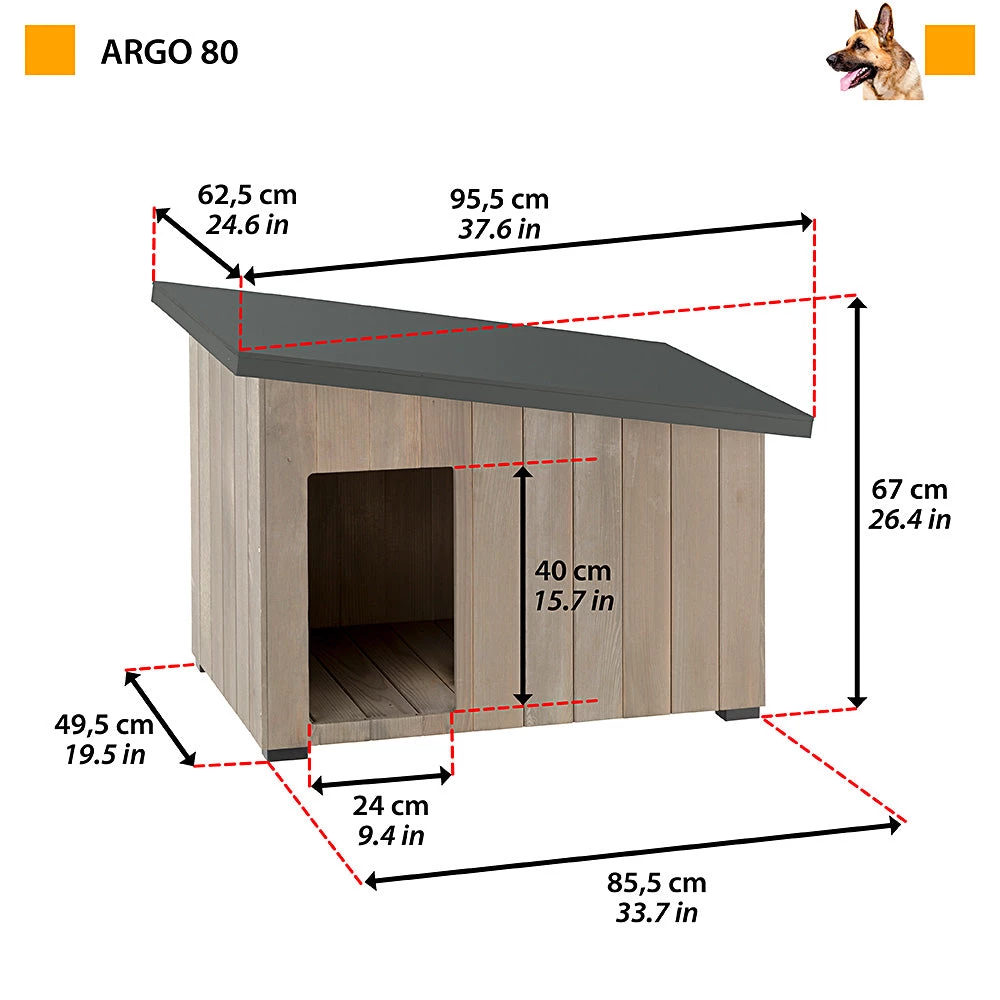 Wie alle Ferplast-Hundehütten aus Holz verfügt auch das Modell Argol über eine Konstruktion mit einem leicht geneigten Dach, um die Ableitung von Regenwasser zu ermöglichen. Argo ist sowohl intern als auch extern mit einem speziellen Lackierverfahren behandelt, um maximale Widerstandsfähigkeit gegen alle klimatischen Bedingungen zu gewährleisten. Das Holz ist durch einen ökologisch unbedenklichen und schimmelhemmenden Lack, der in Fließbeschichtungstechnologie aufgebracht wird, gegen UV-Strahlen beständig und wasserabweisend.