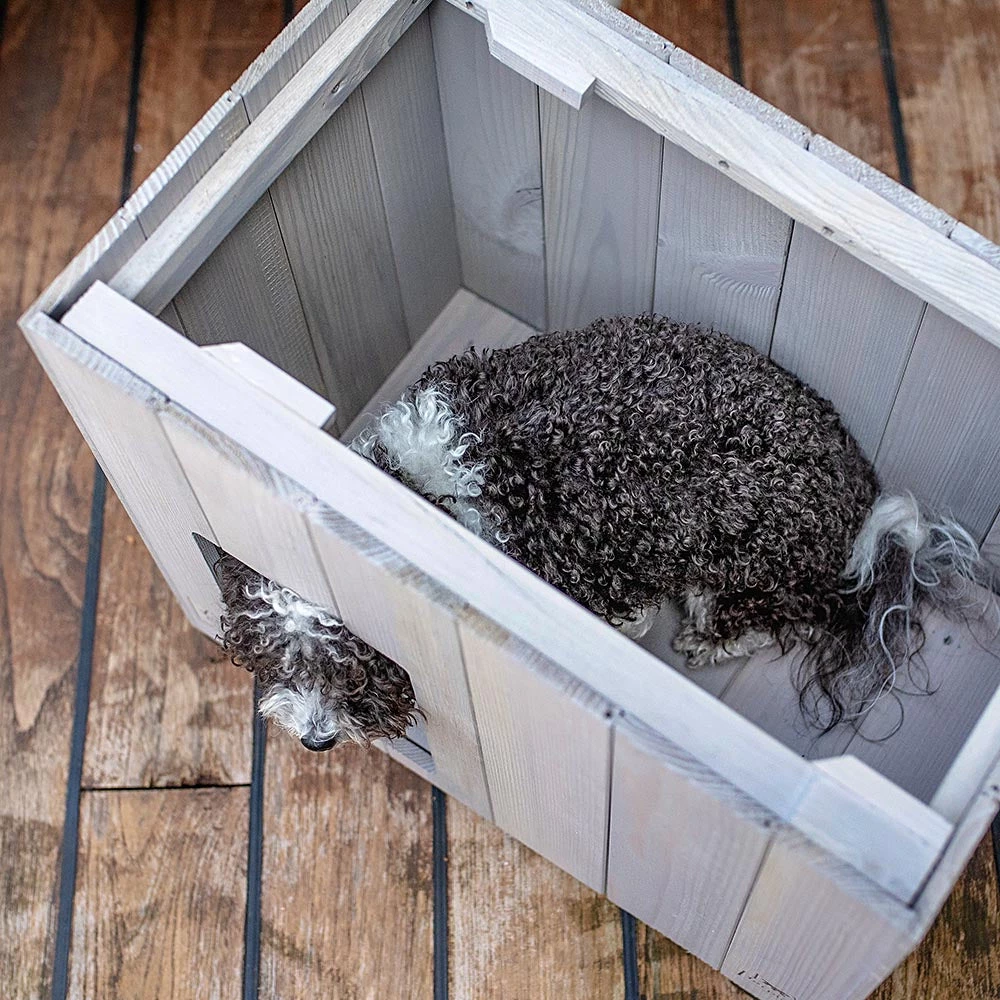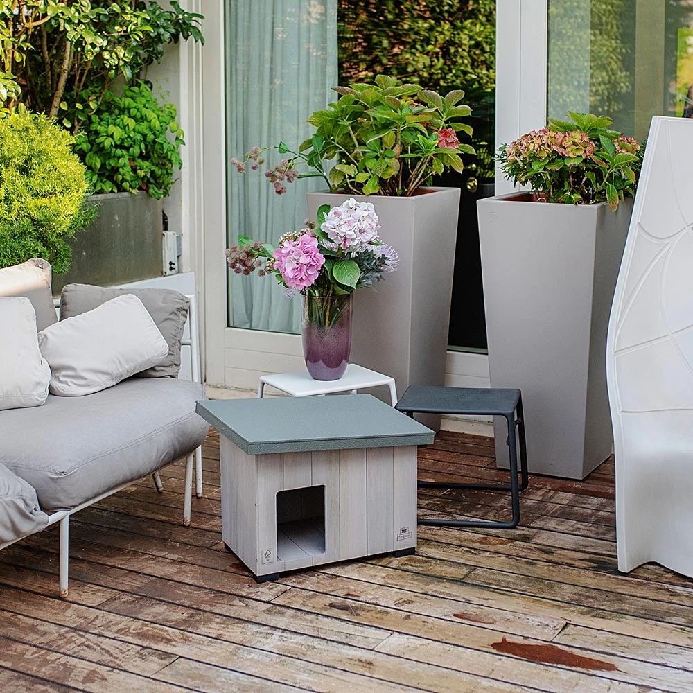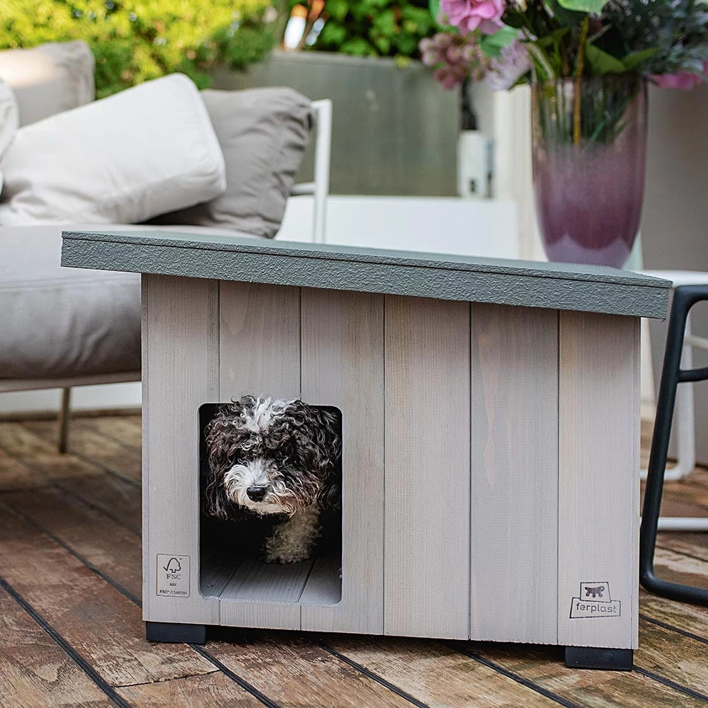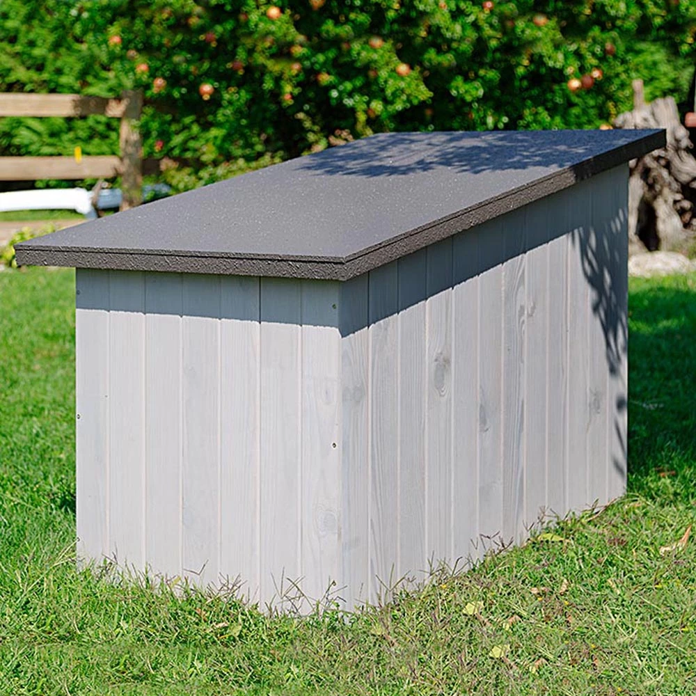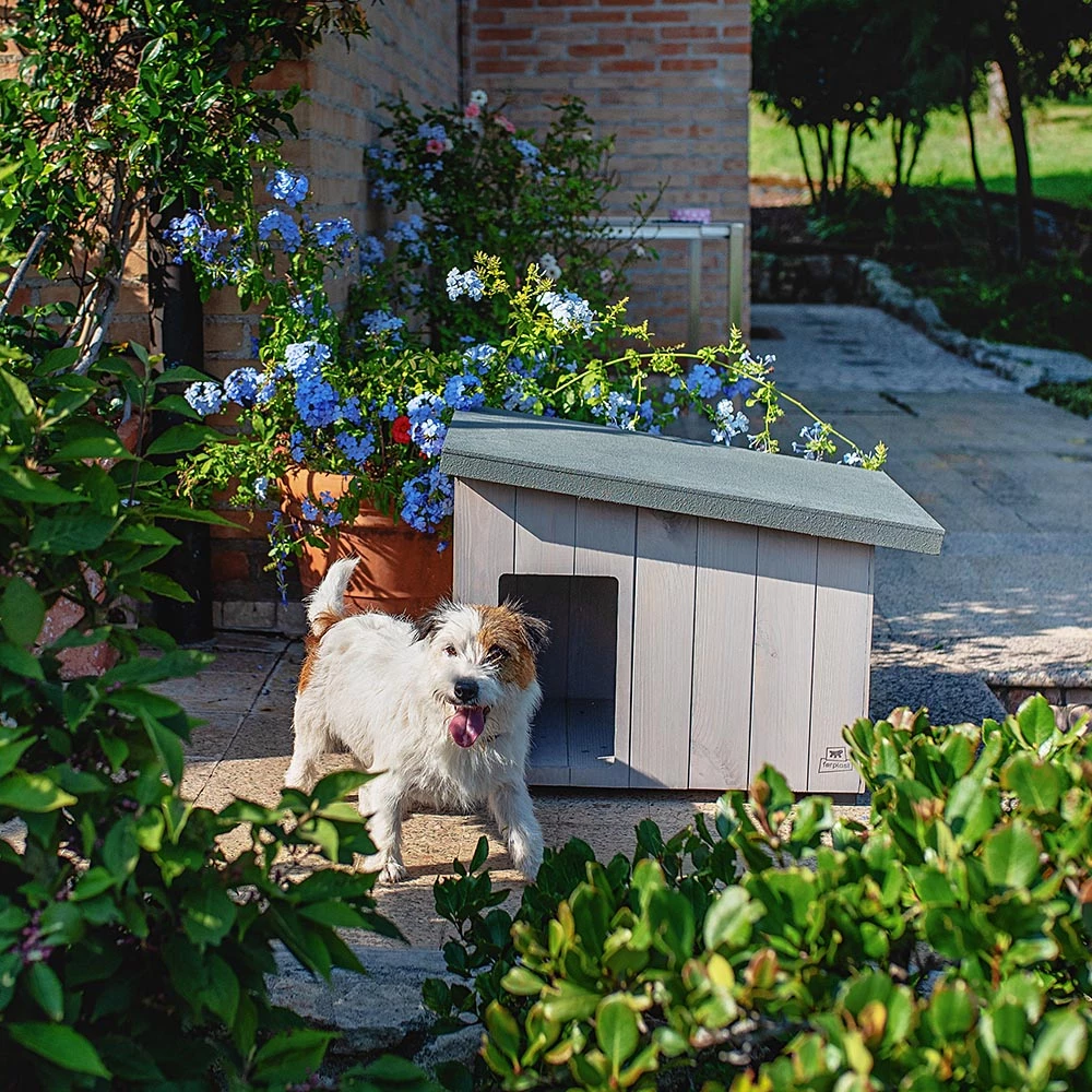 Die Hundehütte Argo besteht aus FSC™ -zertifiziertem nordischem Kiefernholz, das heißt es stammt aus Wäldern, die nach strengen Umwelt-, Sozial- und Wirtschaftsstandards verantwortungsbewusst bewirtschaftet werden und anderen kontrollierten Quellen. Sie ist für eine lange Lebensdauer ausgelegt und ideal für den Außenbereich. Ein komfortabler Zufluchtsort für Ihren treuen Freund zu jeder Jahreszeit. Der für die Außenseite gewählte Farbton verleiht diesem kleinen Cottage einen sehr modernen Stil.