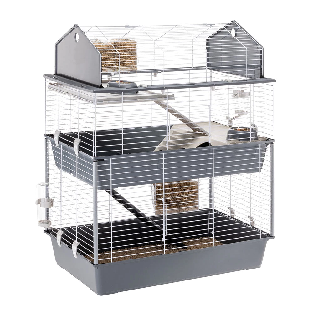 Barn 100 Double ist ein geräumiger Lebensraum für Kaninchen, der dank seiner Struktur auf drei Ebenen eine große Grundfläche bietet. Der Nagerheim, nach dem Vorbild der kleineren Barn-Version entworfen, behält seine ursprüngliche Form bei, die an eine amerikanische Scheune mit einem erhöhtem Dach erinnert, und bietet dank seiner verschiedenen Ebenen mehr Wohnraum. Es verfügt über zwei geräumige Etagen, die durch eine bequeme Leiter miteinander verbunden sind, und einen zusätzlichen Dachboden mit einer großen Öffnungsklappe, um einen vollständigen Zugang für die täglichen Wartungsarbeiten zu ermöglichen. Das Habitat ist komplett mit notwendigem Zubehör wie Heuraufe, Schalen und Trinkflaschen sowie einem kleinen Haus zum Ausruhen ausgestattet.