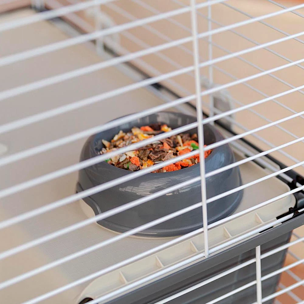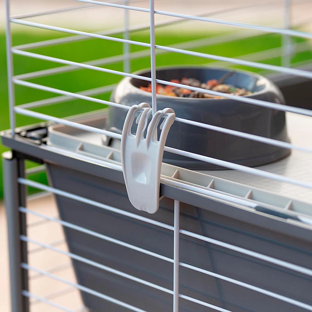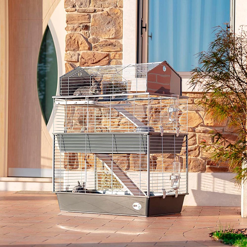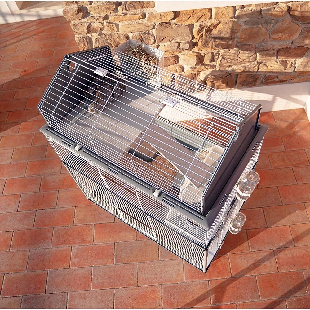 Das Barn 100 Double Kaninchenheim kann komplett zerlegt werden, um sein Volumen zu reduzieren. Er besteht aus robustem, lackiertem Metallgitter und Bodenwannen aus thermoplastischem Harz, die Schmutz, Einstreu und Futterreste effektiv auffangen. Auf der Vorderseite befinden sich praktische Schiebetüren, speziell für die Sicherheit Ihres Haustiers entwickelt. Für eine gründlichere Reinigung ist es außerdem möglich, das Gittern und die Bodenwannen vollständig voneinander zu trennen.