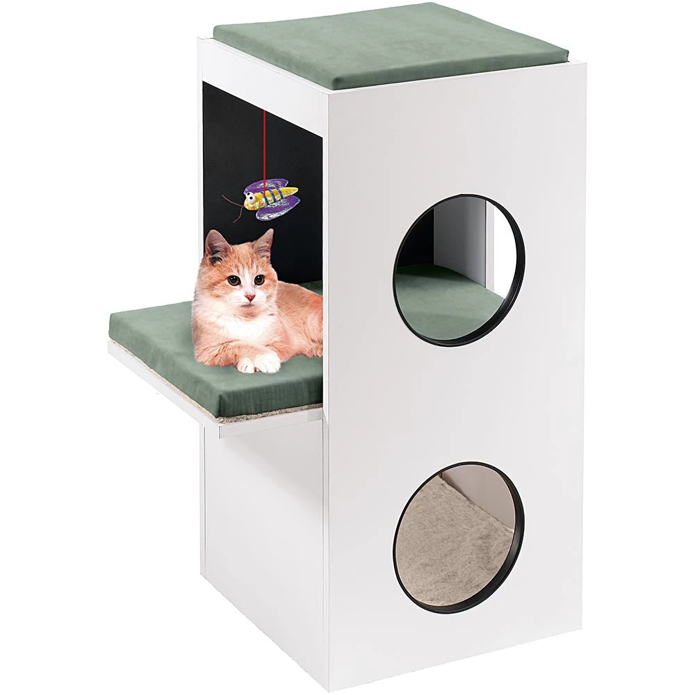 Mit dem vertikalen turmartigen Aufbau, wird dieses Katzenmöbelstück Ihrem Freund eine einladende Unterkunft ermöglichen und hält Ihre Katze gleichzeitig fit. Die beiden Löcher in der Vorderseite sind entworfen worden, um sicherzustellen, dass Ihre Katze einen einfachen Zugang hat und einfach in ein Loch hineinspirngen kann. Blanco ist ein großes zentrales Regal mit einem bequemen zweiseitigen Kissen, welches Sie frei nach Ihren Bedürfnissen in unterschiedlicher Weise nutzen könnten. Im unteren Teil befindet sich ein weiches Bett, wo Ihre Katze schlafen kann und sicher vor neugierigen Blicken ist. Im Obergeschoss befindet sich ein Katzenspielzeug in Ballform aus Sisal, das zur Unterhaltung Ihres Freundes dient.