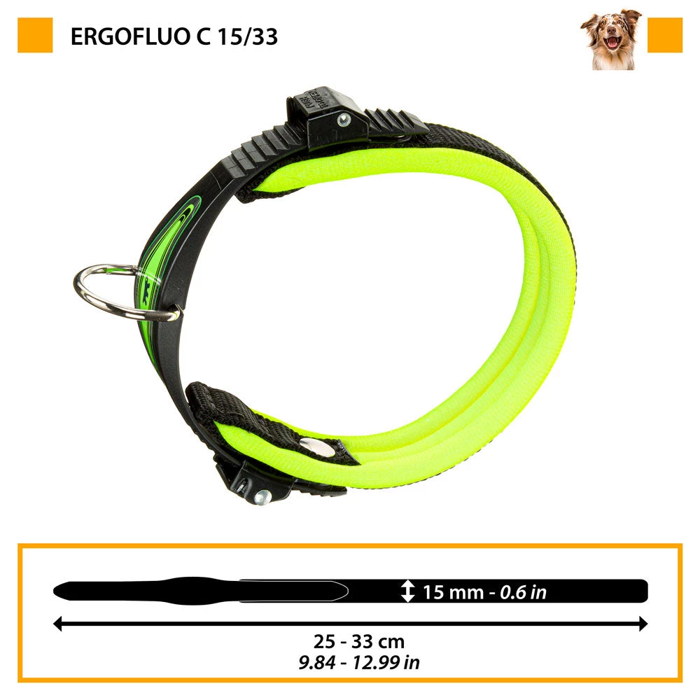 Mit dem Ergofluo erhalten Sie maximalen Komfort für Ihren Hund, durch einfache Handhabung und perfekte Passform! Das gesamte Halsband ist gefüttert und in verschiedenen, floureszierenden Farben erhältlich. Das patentierte Verschlusssystem garantiert das passgenaue und einfache Anlegen. Hergestellt aus robustem Nylon und ausgestattet mit dem innovativem Quick-Release System, läßt sich das Halsband mit einem einfachen Handgriff entfernen. Die große Ergofluo Reihe bietet viele trendige Farben, die einzelnen Modellbeschreibungen differenzieren in der Größe der Metallschnalle (15 oder 25mm) und dem Umfang (zwischen 25 und maximal 60 cm), und unterteilen somit die verschiedenen Gewichtsklassen (für ein Gewicht von 20 bis 60 kg). Das Modell C15/33 beispielsweise ist geeignet für Hunde bis 20 Kg, C15/42 für Hunde bis 30 Kg, C25/51 für Hunde bis 40 Kg und schließlich das Modell C25/60 für Hunde bis 60 Kg.