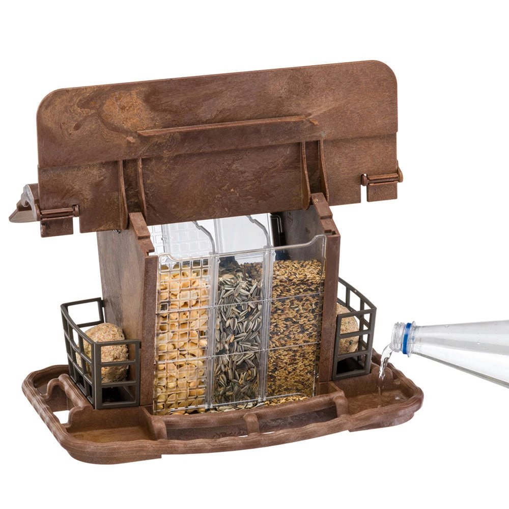 Jok sind innovative Produkte, mit denen Sie Wildvögel mit Nahrung und Futter versorgen können und die auch zu einem hervorragenden Unterschlupf werden können, wenn die mitgelieferten transparenten Elemente nicht montiert werden. Als Futtersilo verwendet, kann Jok durch die speziellen Trennwände je nach gewähltem Modell mit einer, zwei oder drei verschiedenen Samen- oder Erdnusssorten gefüllt werden: Auf diese Weise stellen Sie die notwendige Nahrung für Wildvögel sicher, insbesondere während der Fütterung kältere Monate. Jok 2 hat zum Beispiel auch spezielle Fächer, um sauberes und frisches Wasser oder Fettbällchen zu liefern, die in die Seitengitter gesteckt werden können. Darüber hinaus sind die transparenten Paneele sehr nützlich, da sie es Ihnen ermöglichen, den Füllstand des verfügbaren Futters schnell zu überprüfen.