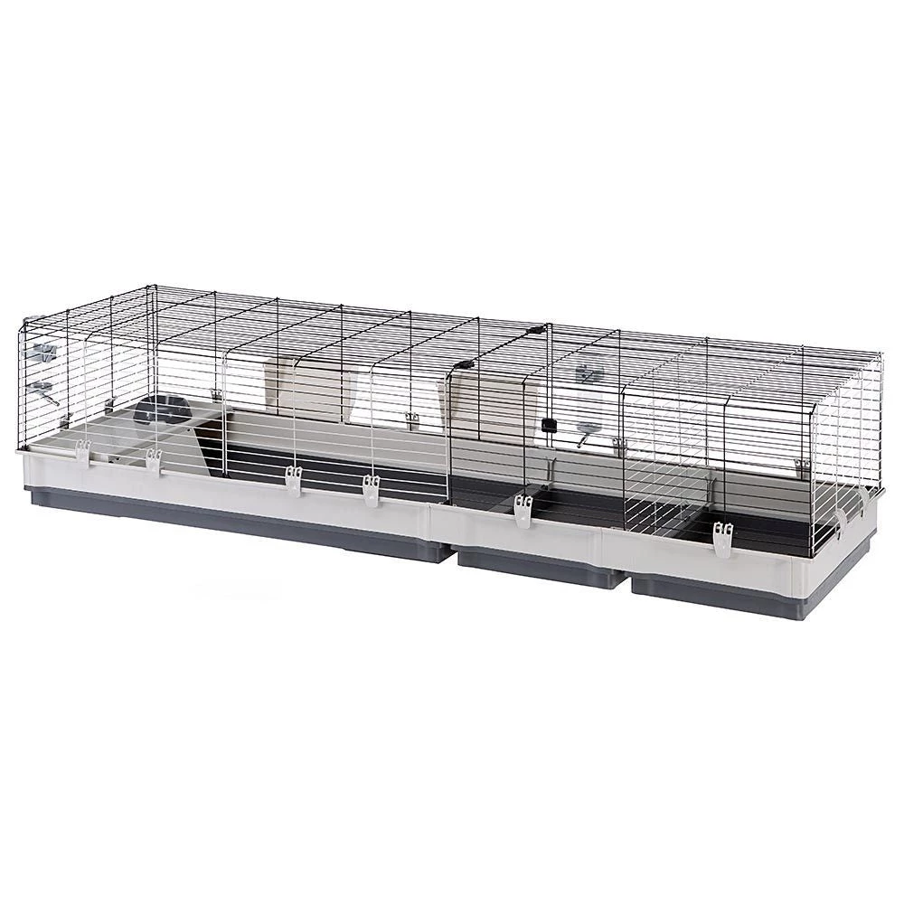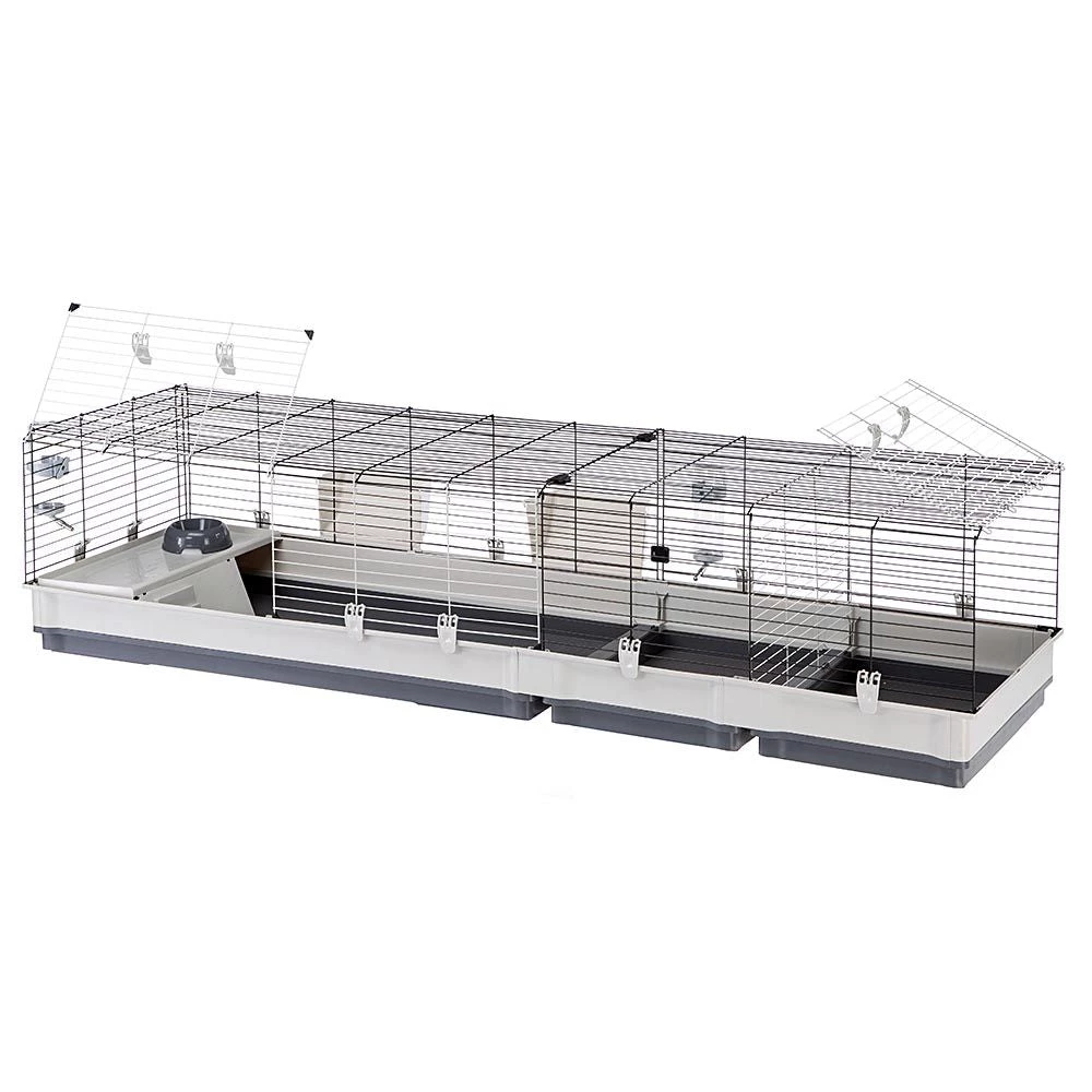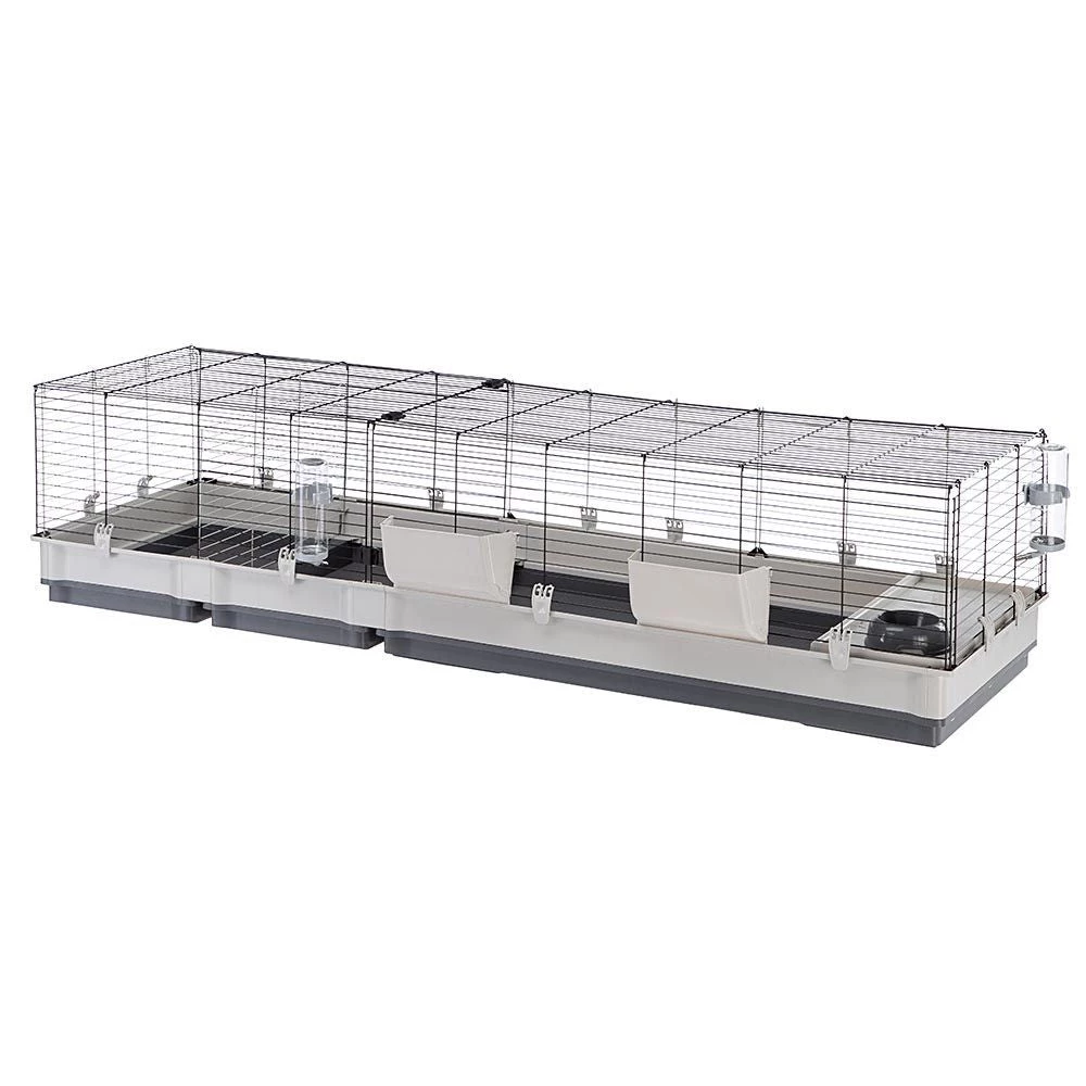 Das Modell Krolik 200 ist mit Zubehör wie Heuraufen, Trinkflaschen, Näpfen und einem Haus mit Stufen zur Ebene ausgestattet. Ein praktisches Trenngitter ermöglicht es Ihnen, den Lebensraum in zwei Teile zu trennen: eine sehr nützliche Funktion während der Entwöhnungsphase der Jungtiere, um z. B. Mama und Kaninchen getrennt zu halten.