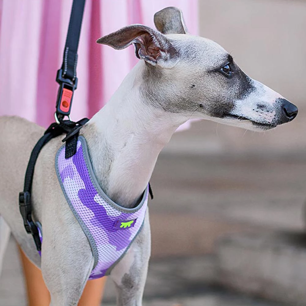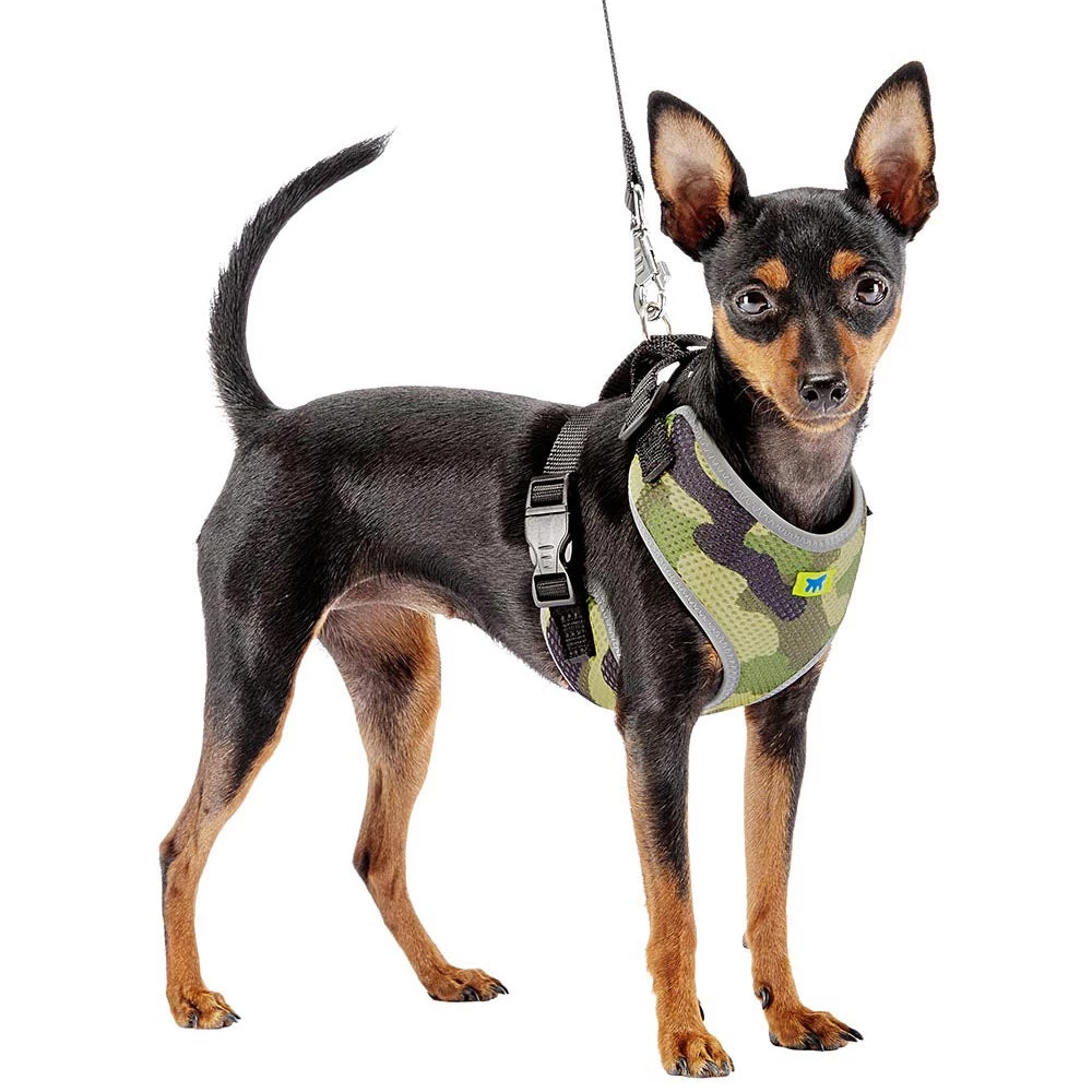 Wenn Sie außerdem immer modisch sein wollen, werden Sie sich diese Fashion-Version sicher nicht entgehen lassen, die sich durch ein sehr aktuelles Camouflage-Muster in drei verschiedenen Farben auszeichnet. Und das, ohne die Sicherheit Ihres Hundes zu vernachlässigen: Die Geschirre haben nämlich reflektierende Ränder, um die Sichtbarkeit auch bei schlechten Lichtverhältnissen, bei Abend- oder Nachtausflügen zu gewährleisten. Sie sind in verschiedenen Größen erhältlich, ideal für kleine und mittelgroße Hunde. Die kleineren Modelle wie XS und S sind auch für Katzen geeignet.