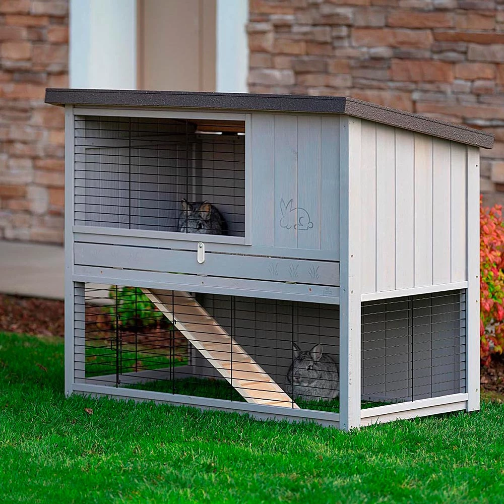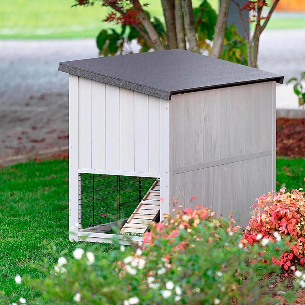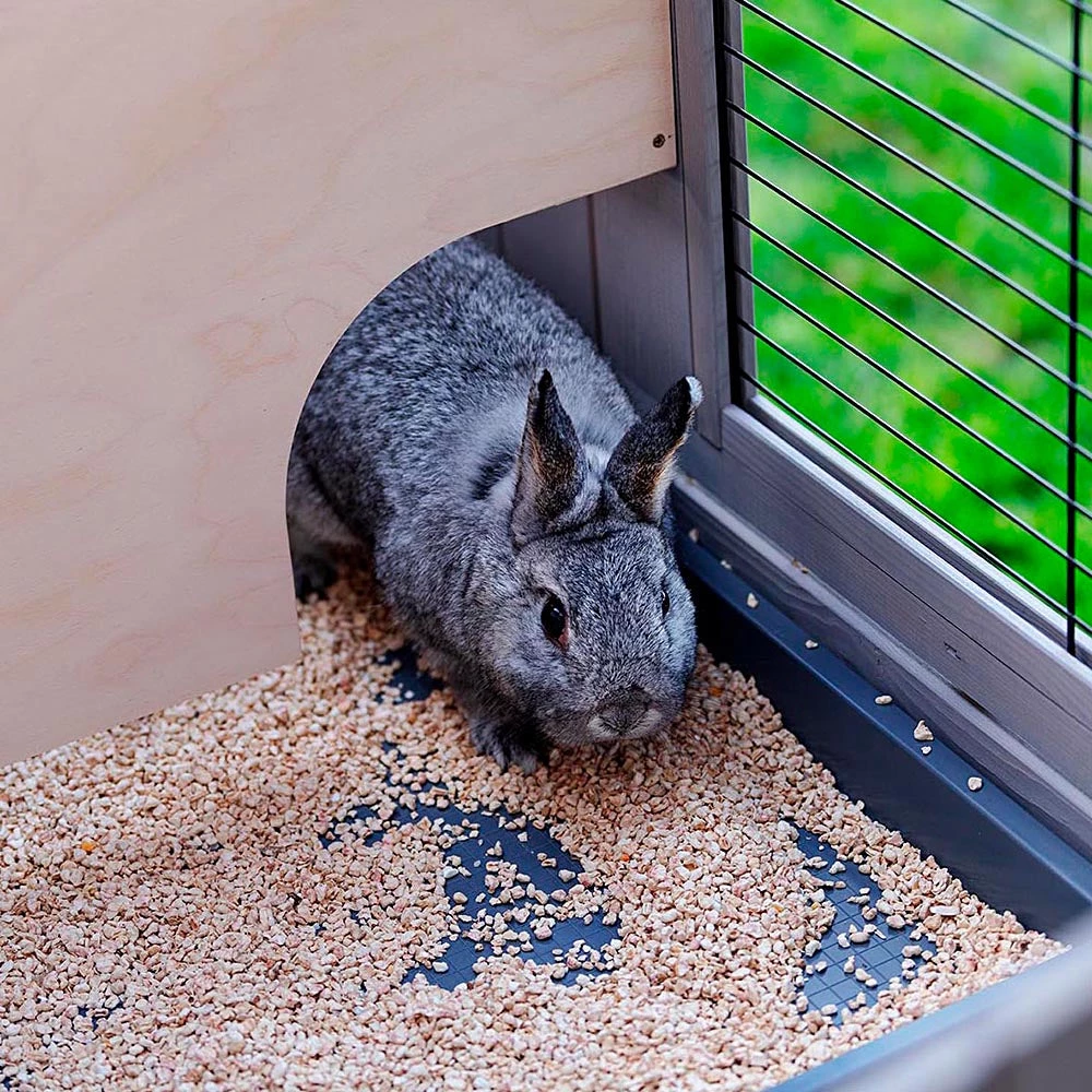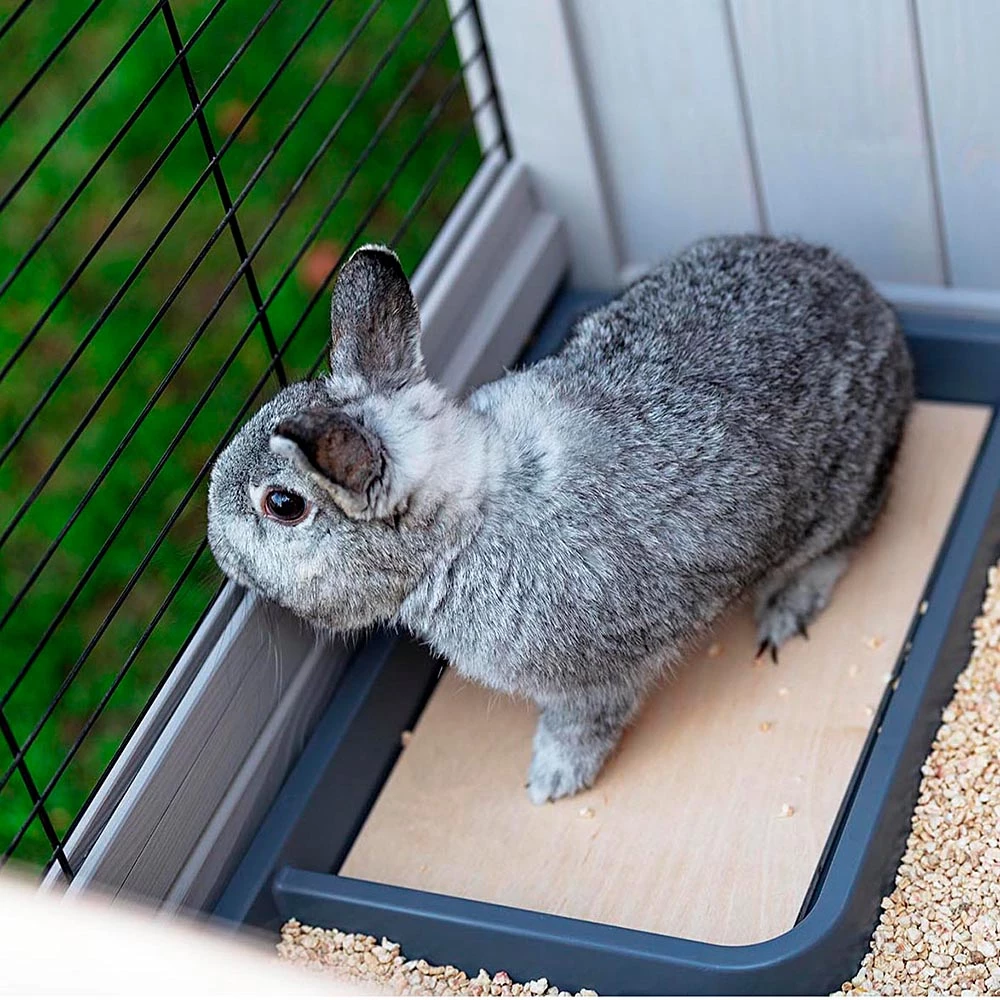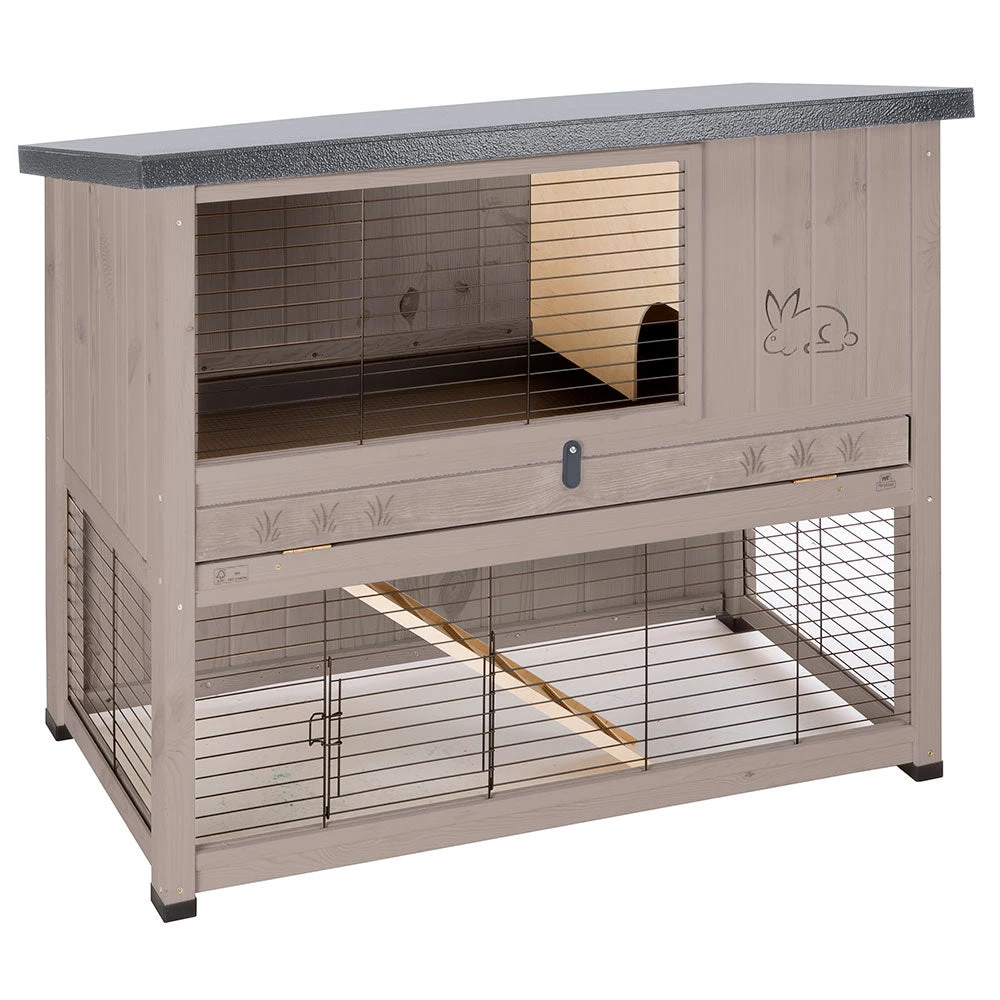 Ferplast hat hier für Ihren pelzigen Freund eine Residenz geschaffen, die an Komfort keine Wünsche offen lässt. Unterteilt in zwei Ebenen hat der kleine Nager hier genug Platz für alle seine Aktivitäten: die untere Etage zum Fressen, Trinken, oder für die Tagesaktivitäten, die obere Etage dient sozusagen als Ruhezone, die über eine Holztreppe erreichbar ist. Unten finden Sie ein Gehege mit Metallzaun und einer Schiebetür mit Sicherheitsverriegelungshaken, und eine Holzleiter für den Zugang zum Obergeschoss, das sich beispielsweise für die Nachtaktivitäten oder Ruhezeiten während des Tages eignet. In dieser Ruhezone gibt es ein komfortables Kaninchenhäuschen und der Boden ist in zwei Plastikschubladen unterteilt, die die Spreu zuverlässig zurückhalten.