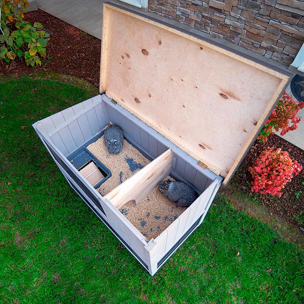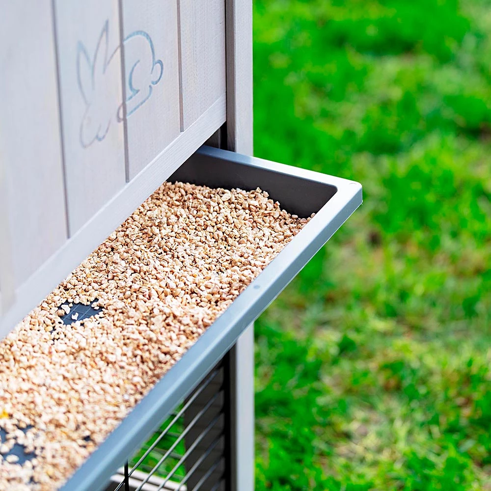 Das Dach ist abnehmbar um im Bedarfsfall einfach an das Tier heranzukommen. Die Reinigung kann leicht und schnell über die ausziehbaren Schubladen erfolgen, die sich hinter der aufklappbaren und durch Riegel gesichterten Luke verstecken. Sehr praktisch auch hier die verschließbare Luke in die untere Ebene um die Schubladen in Ruhe leeren zu können.