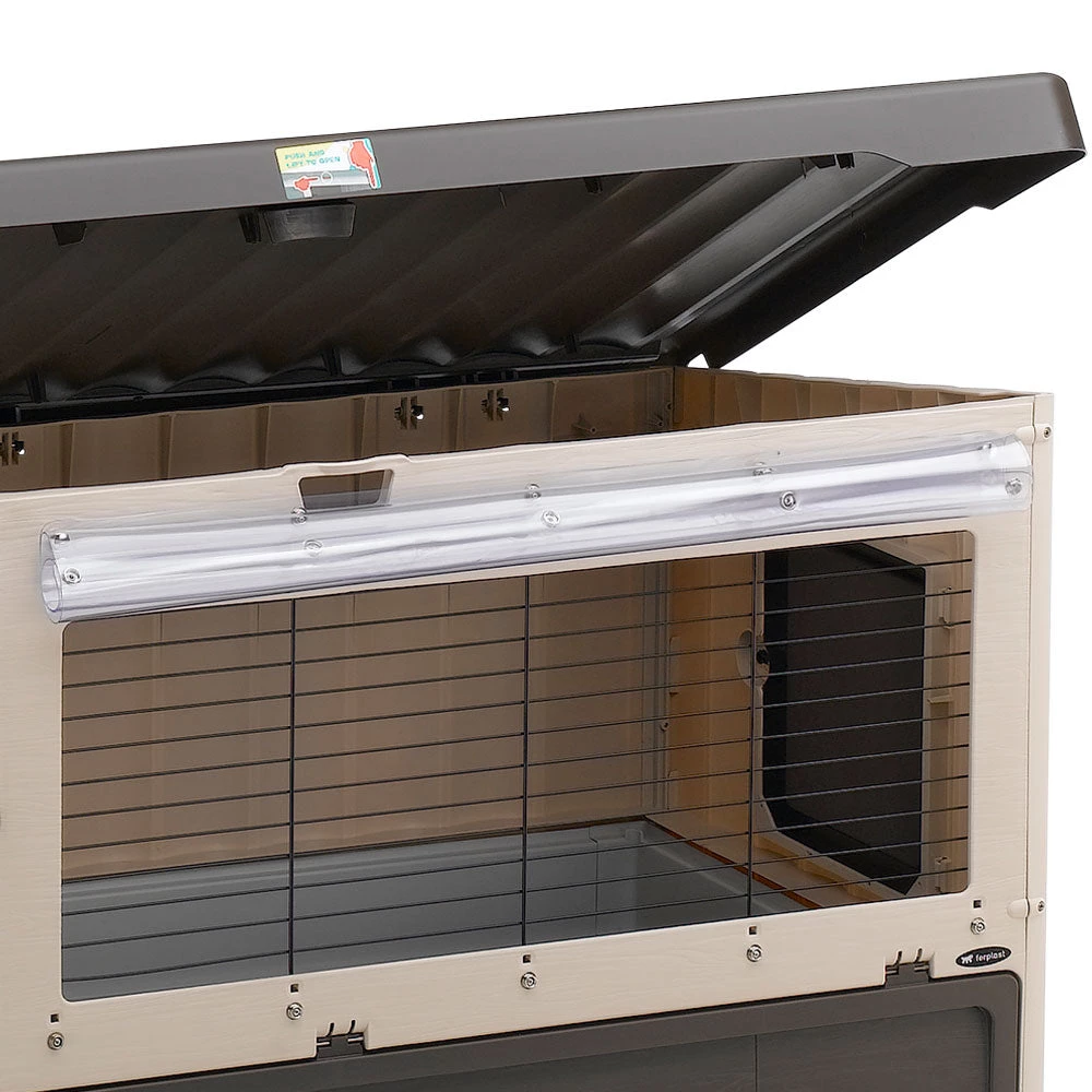 Transparenter PVC Schutzvorhang, der die Front des Hasenheimes abdeckt und somit Ihr Nagetier vor Kälte und Zugluft schützt. Abgestimmt auf die Reihe Grand Lodge und somit passend für die Modelle 120 und 140, 120 Plus und 140 Plus, sowie 160. Zur Fixierung an der Außenwand des Habitat mithilfe der mitgelieferten Schrauben.