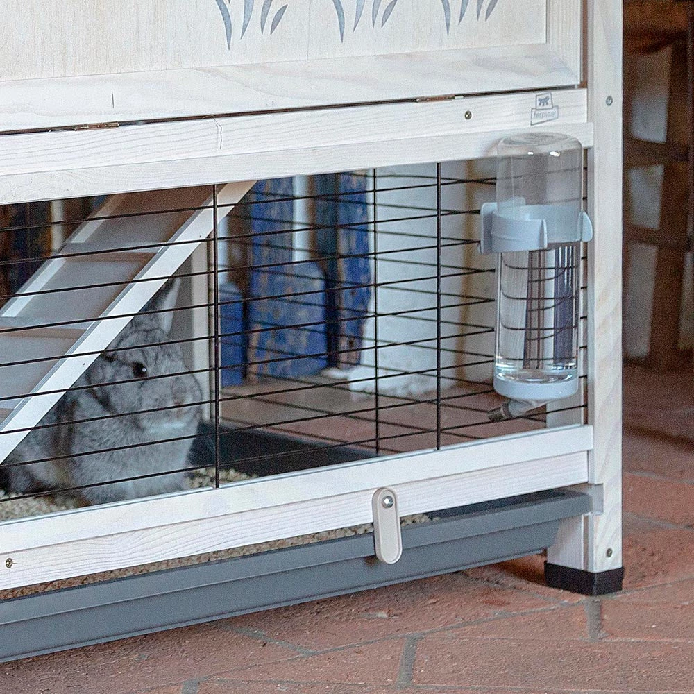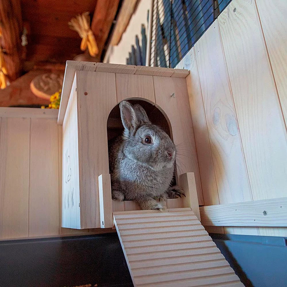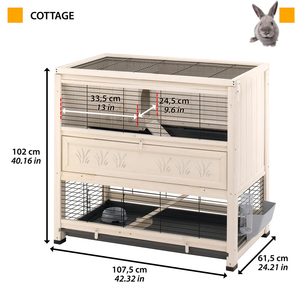 Da Cottage auf zwei Etagen aufbaut, bietet es dem Nagetier viel Platz und Bewegungsfreiheit. Im unteren Teil wurde beispielsweise ein Gehege angelegt, mit einer Schiebetür, die Sie öffnen können um Ihren kleinen Freund herauszulassen. Die Tür ist selbstverständlich mit einem Sicherungshaken fest verschließbar. Der Kaninchenstall ist voll ausgestattet, damit Ihr kleiner Freund dort sofort einziehen kann. Er ist mit einer Trinkflasche, einer Schüssel und einer Heuraufe aus Kunststoff ausgestattet. Eine bequeme leiter bietet Zugang zum Obergeschoss, wo sich ein etwas geschützterer Bereich befindet, der mit einer tiefen Kunststoffwanne ausgestattet ist, die zuverlässig die Streu zurückhält, und einem komfortablen Kaninchenhaus, das über eine kleine Rampe erreichbar ist, die auch als Verschluss für die Öffnung nach unten dient. In diesem bequemen Nisthäuschen kann das Nagetier sowohl nachts als auch tagsüber ungestört ruhen. Das Haus verfügt über ein Klappdach, das einen einfachen Zugang für die tägliche Wartung ermöglicht.