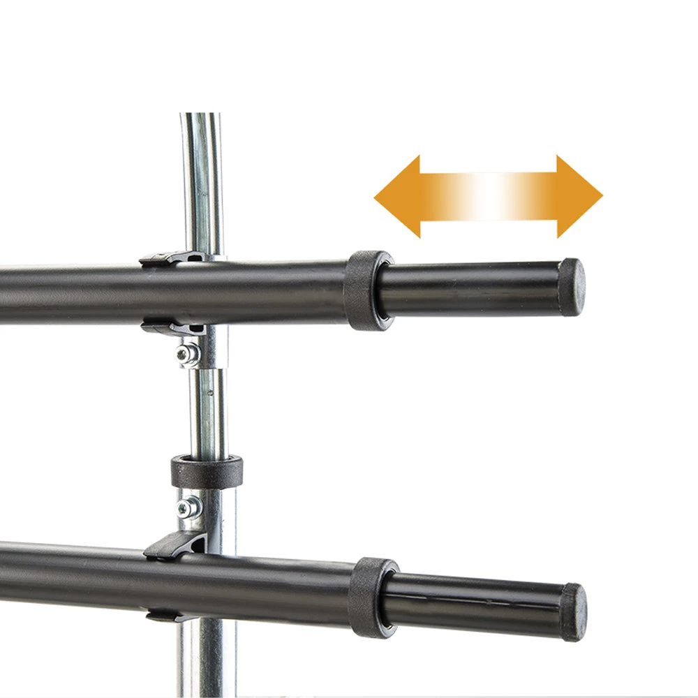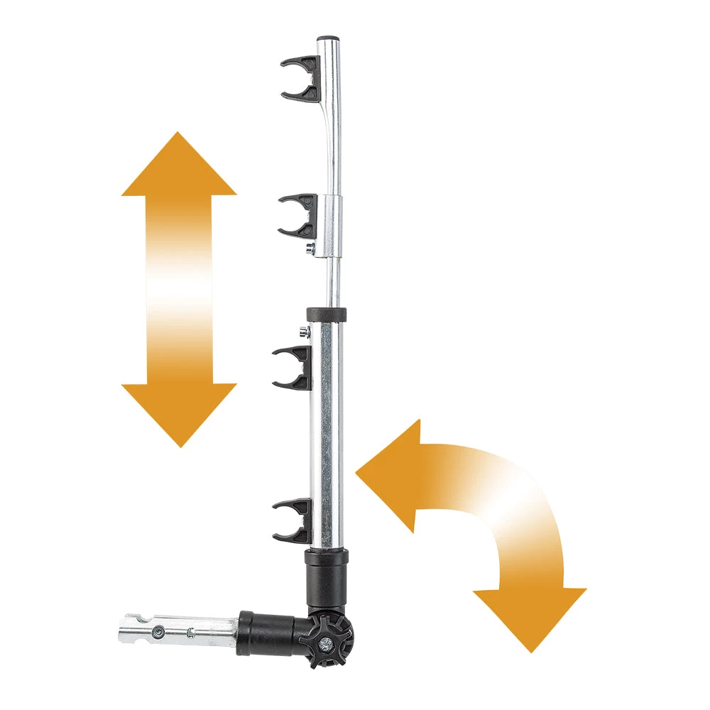 Heben Sie die Kopfstützen an, um die Stützstreben zugänglich zu machen. lockern Sie die untere Verschraubung an den beiden Trennständern und biegen Sie sie um etwa 90 °. Befestigen Sie die Pfosten an den freiliegenden Stützen der Kopfstützen und ziehen Sie sie mit dem mitgelieferten Inbusschlüssel fest. Stellen Sie die beiden Pfosten auf die gewünschte Höhe ein und sichern Sie diese mit dem Inbusschlüssel. Fixieren Sie die korrekte Neigung der Pfosten mit den zwei Drehknöpfen. Haken Sie nun die Teleskoprohre an den beiden Stützstreben ein und stellen Sie deren Länge ein (die Fixierung / Entsperrung erfolgt durch Drehung der beiden Rohre).
