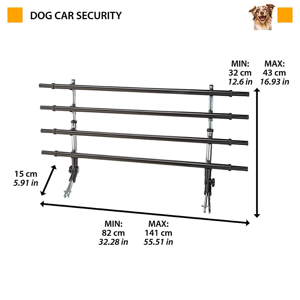 Universal geeignet für alle Kombi-Autotypen, Dog Car Security trennt den Kofferraum des Autos von der restlichen Fahrgastzelle und ermöglicht so den Hund sicher zu transportieren, ohne das dieser die Fahrt stört. Robust und verläßlich, da aus lackiertem Edelstahl. Die Abtrennung kann einfach an den hinteren Kopfstützen befestigt werden und an die Breite und Höhe des Zwischenraumes von Kofferraum und Fahrgastzelle angepasst werden. Made in Italy. Maße: mind. 82 x 15 x 32 cm Höhe, max. 141 x 15 x 43 cm Höhe.