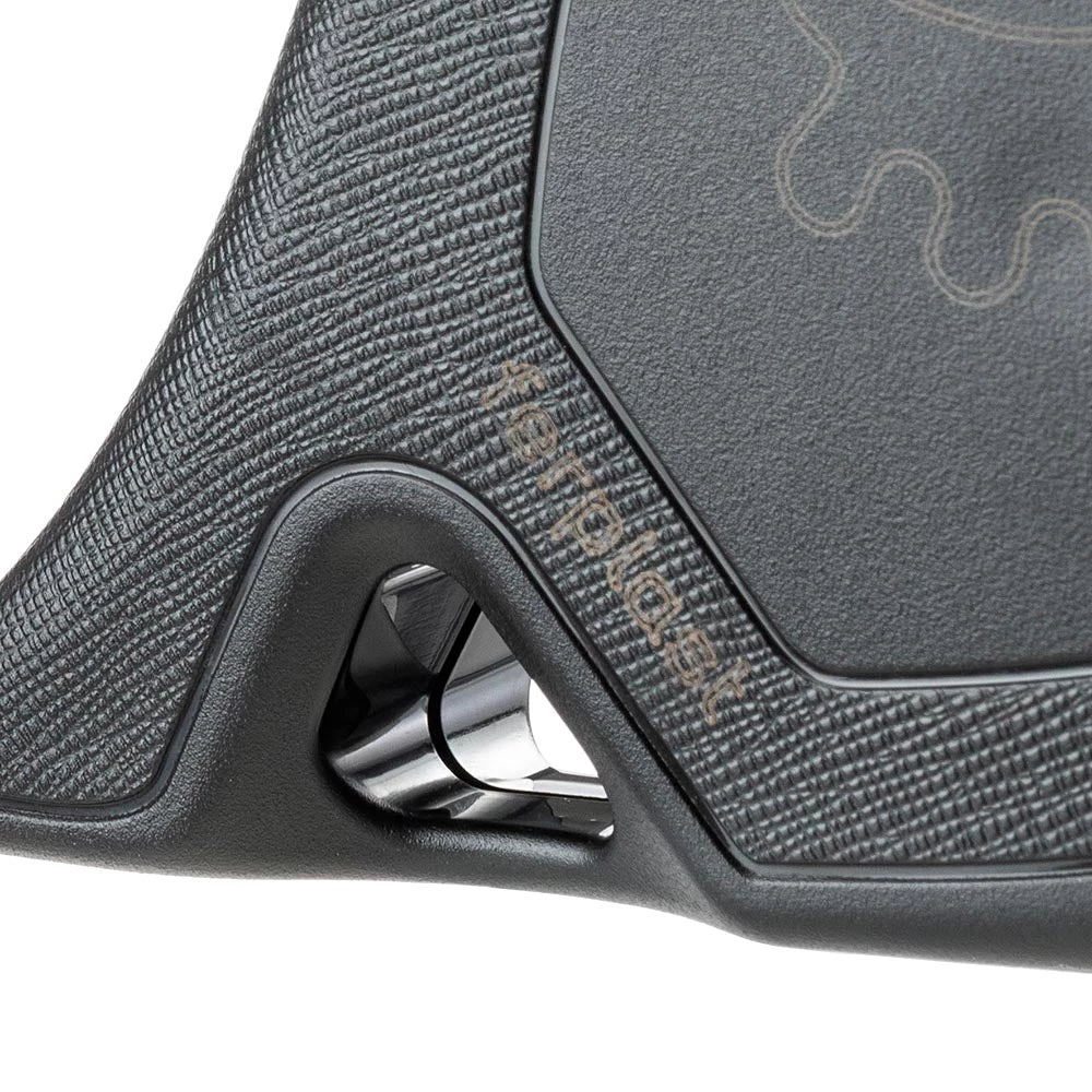 Der ergonomische Knopf mit 3 Funktionen – freies Schieben, kurzzeitige Verriegelung und dauerhafte Verriegelung des Lanyards / Gurtbandes in der gewünschten Länge – garantiert Zuverlässigkeit und Präzision bei der Steuerung. Um beispielsweise von der Stoppposition in die Freigabeposition zu gelangen, reicht ein fester Druck auf den Knopf aus. Das Gleiten des Lanyards und des Gurtbandes ist sehr flüssig und leise, mit einem System, das ein Verdrehen verhindert.