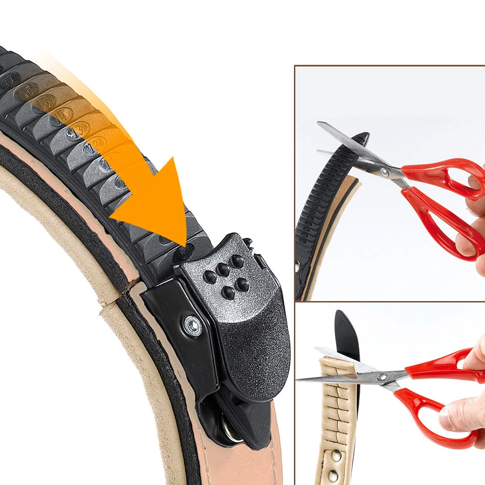 Lederhalsbänder Giotto für Hunde bieten dank des patentierten Mikro-Regulationssystems und ihrer weichen Innenpolsterung einen perfekten Tragekomfort. Dieses Halsband aus beigem Leder hat einige kleine, pyramidenförmige Metall-Applikationen. Ideal für Hunde, die sich von den anderen abheben möchten!