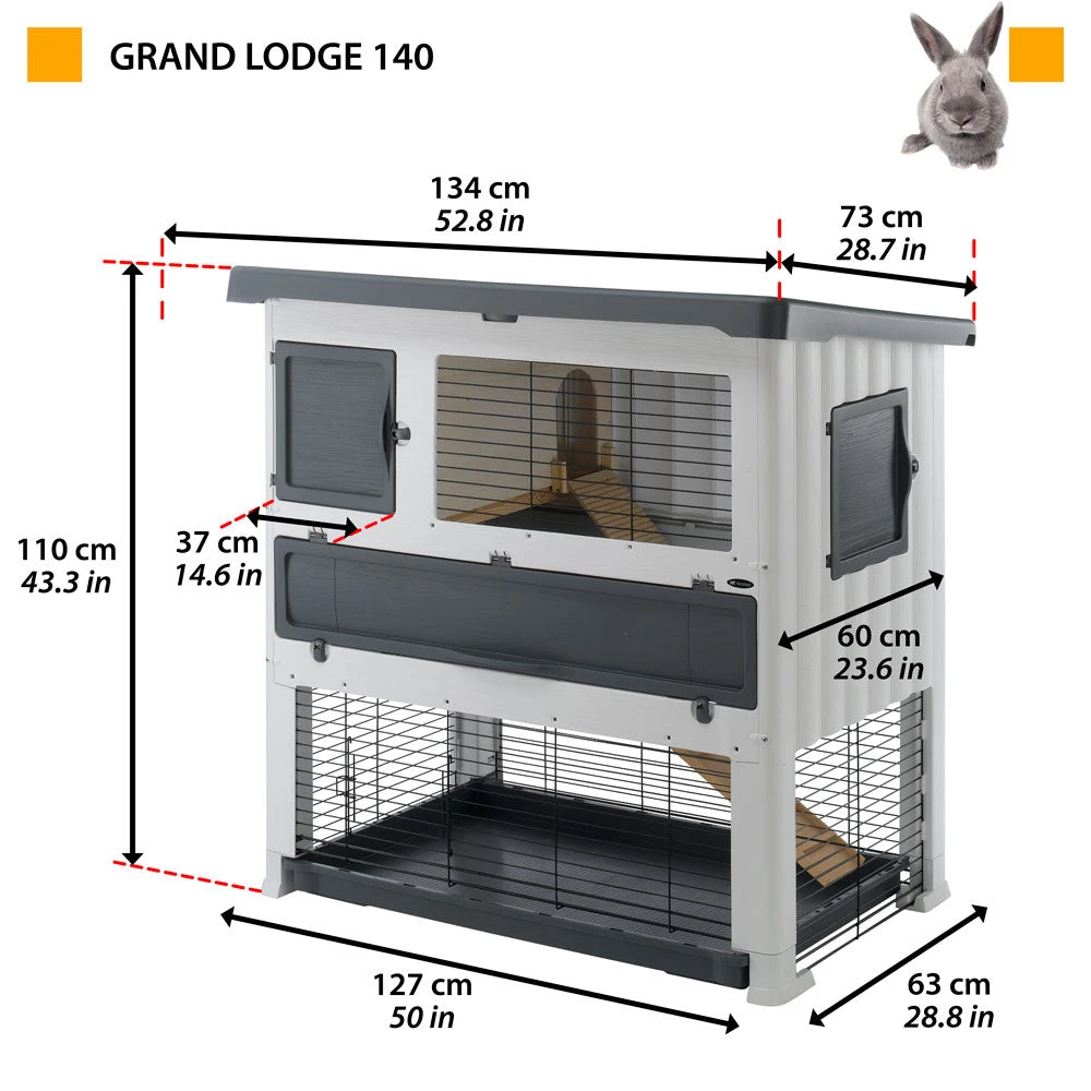 Grand Lodge 120 und 140 Plus sind das ideale Zuhause für alle Kaninchen, die viel Freiheit geniessen möchten. Die Kunststoff-Ställe haben ein sehr stabiles Gestell mit leicht abfallendem Dach und abgerundete Ecken.