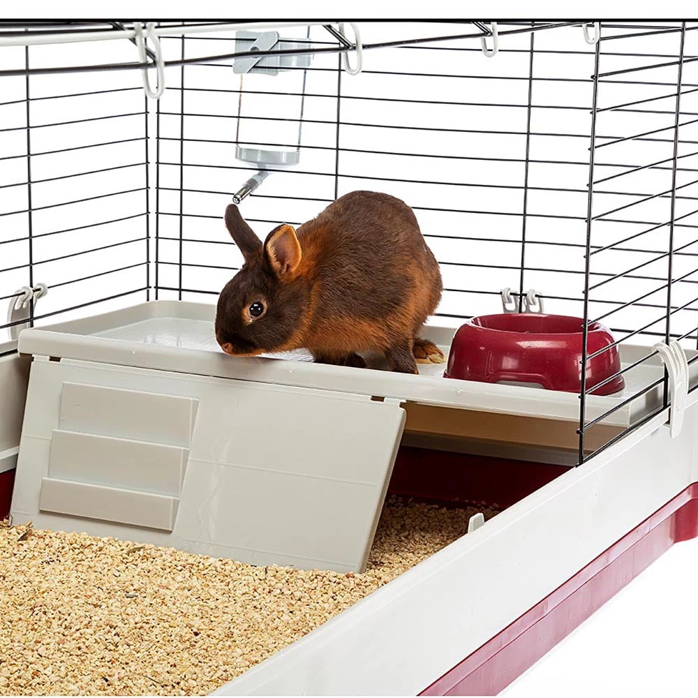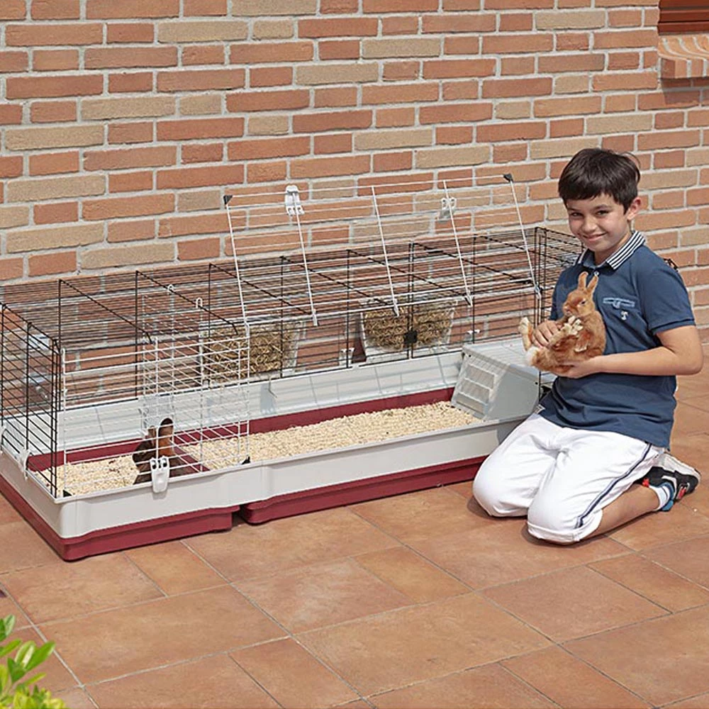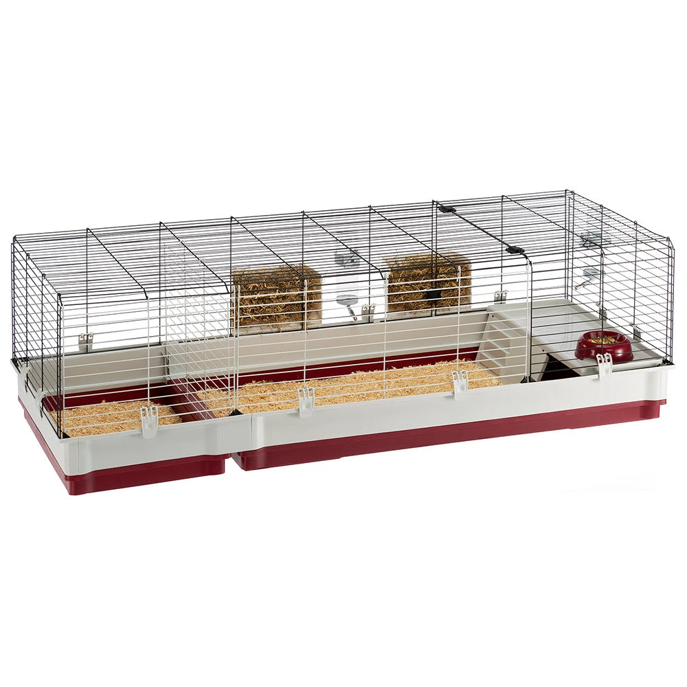 Das Modell Krolik 160 ist sehr geräumig, ideal für die gleichzeitige Unterbringung mehrerer Kaninchen und mit allem Komfort ausgestattet: Im Inneren befindet sich ein komfortables Kunststoffhaus mit einem Napf, einer Heuraufe und einer Trinkflasche. Der Lebensraum ist ideal, um mehrere Kaninchen unterzubringen: Dank eines speziellen herausnehmbaren Gitters können zwei separate Bereiche gestaltet werden, in denen die Kaninchen Nester in ihrem eigenen Bereich bauen können, sodass sie die nötige Sicherheit haben. Der Boden des Käfigs kann mit großer Leichtigkeit gelöst werden, wobei eine vollständige Sicherheit gewährleistet ist, da die kürzlich neu gestalteten Befestigungsklammern das Entweichen des Tieres verhindern und zudem zuverlässig und einfach zu bedienen sind.
