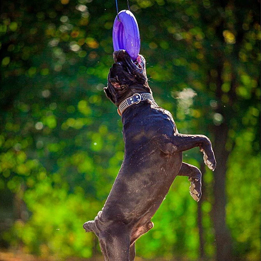 SPRINGEN: Der Hund springt und schnappt den Puller in Ihrer Hand. Sobald der Hund den ersten Ring festhält, zeigen Sie ihm sofort wieder den zweiten. Diese Übung schult die Aufmerksamkeit und Reaktion des Hundes.