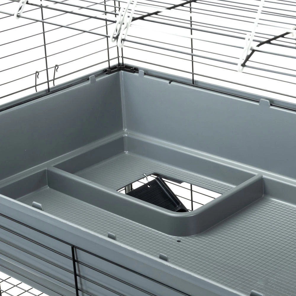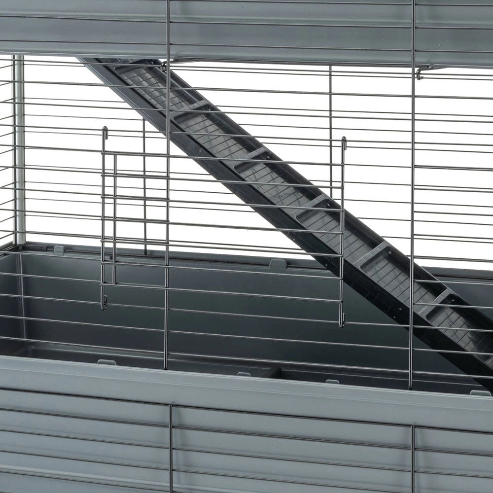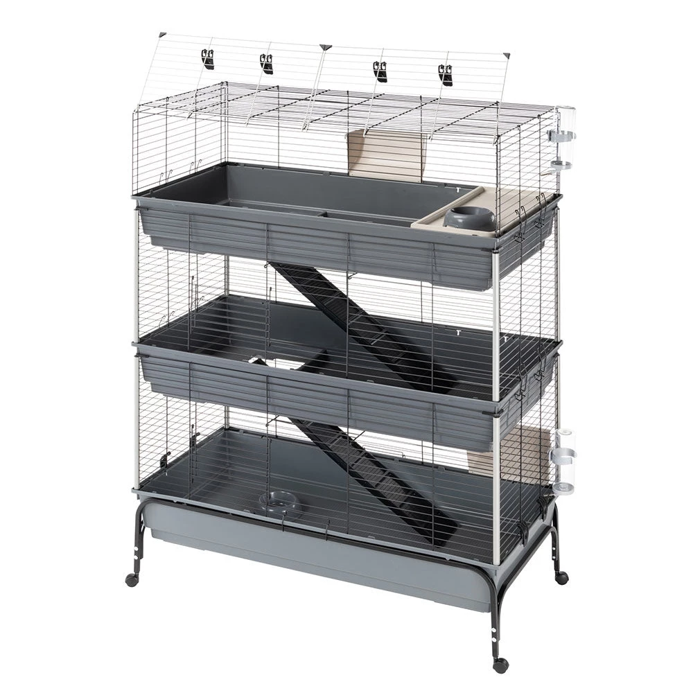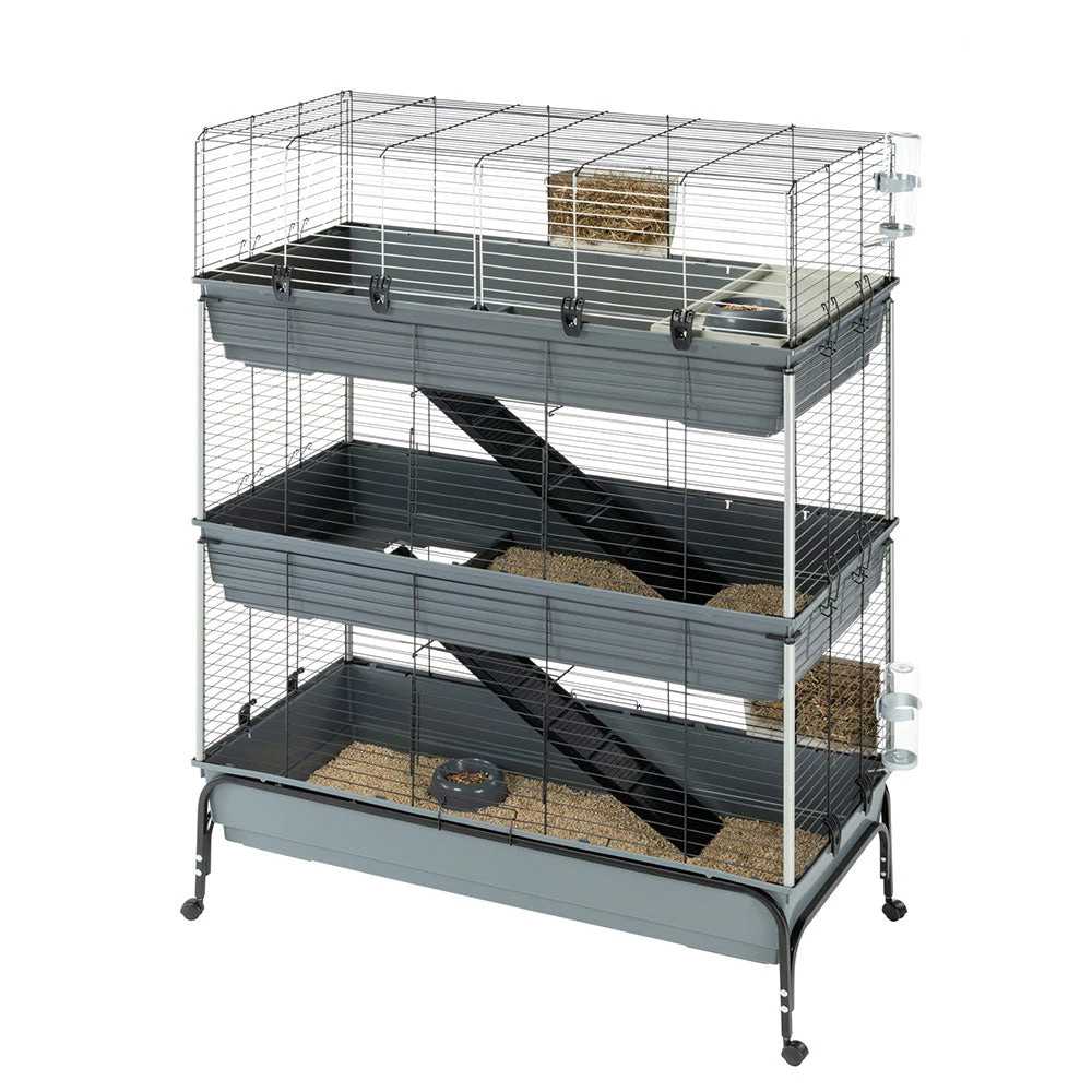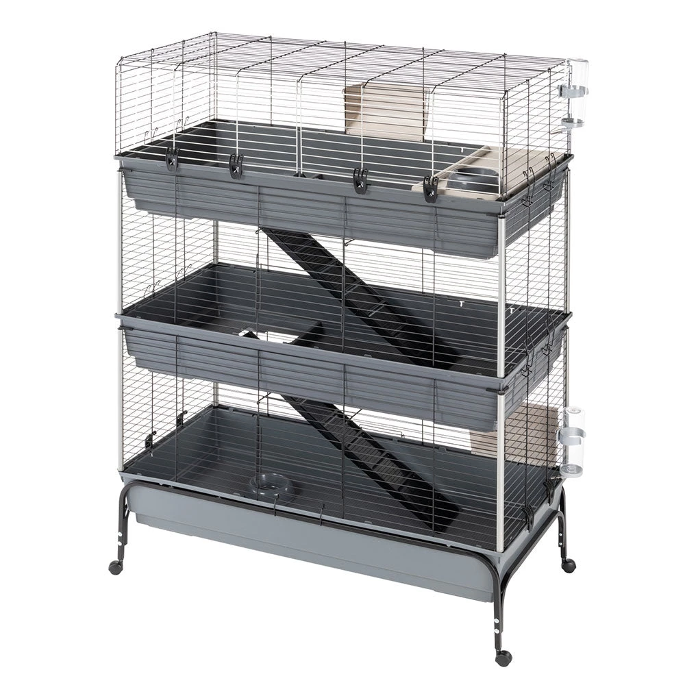 Mit Rabbit 120 Tris haben Ihre süßen Kaninchen drei Stockwerke für sich! Der Lebensraum, in dem auch mehrere Tiere leben können, zeichnet sich durch Weitläufigkeit und maximalen Komfort aus. Die Metallgitterstruktur ist mit einer speziellen Korrosionsschutzfarbe behandelt, um maximale Beständigkeit und Haltbarkeit zu gewährleisten. Ergänzt werden diese durch seitliche Kunststoffsäulen, um eine größere Stabilität zu erreichen. Die drei geräumigen Böden aus thermoplastischem Harz fangen zuverlässig Schmutz, Speisereste und Exkremente auf und verhindern, dass diese nach außen gelangen. Der Käfig ist mit Zubehör wie Heuraufen, Trinkflaschen, Schüsseln und einem Rückzugshäuschen für entspannende Momente ausgestattet, das Sie ganz nach Ihren Wünschen positionieren können. Zwei bequeme Holzleitern ermöglichen dem Haustier einen einfachen Zugang zu den verschiedenen Ebenen.
