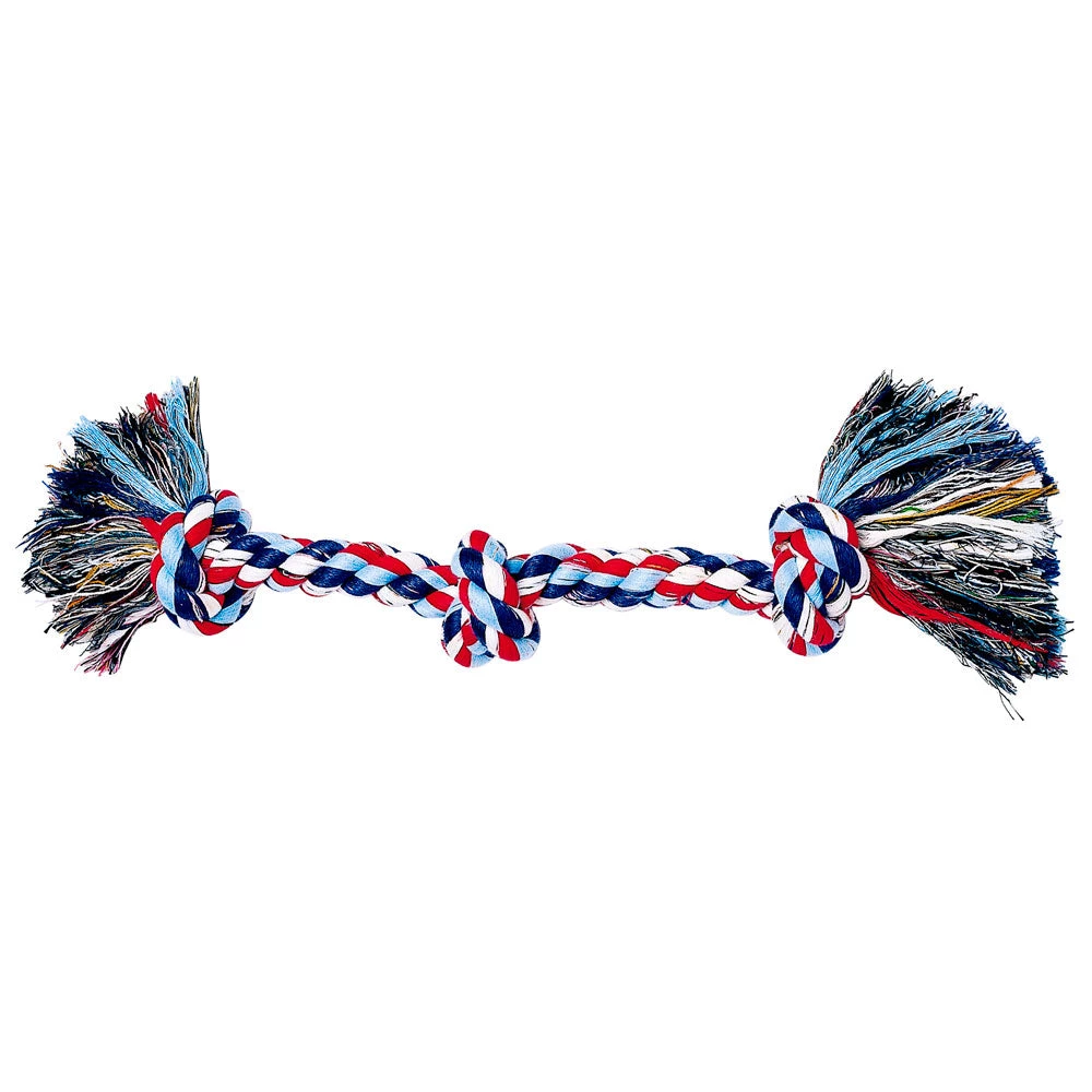 Spieltau aus Baumwolle mit Knoten in der Mitte und an den Enden für wilde Zerrspiele mit Ihrem Hund. Baumwollspielzeuge wie dieses sind eine gute Alternative zu den herkömmlichen Hundespielzeugen aus Gummi oder Latex.