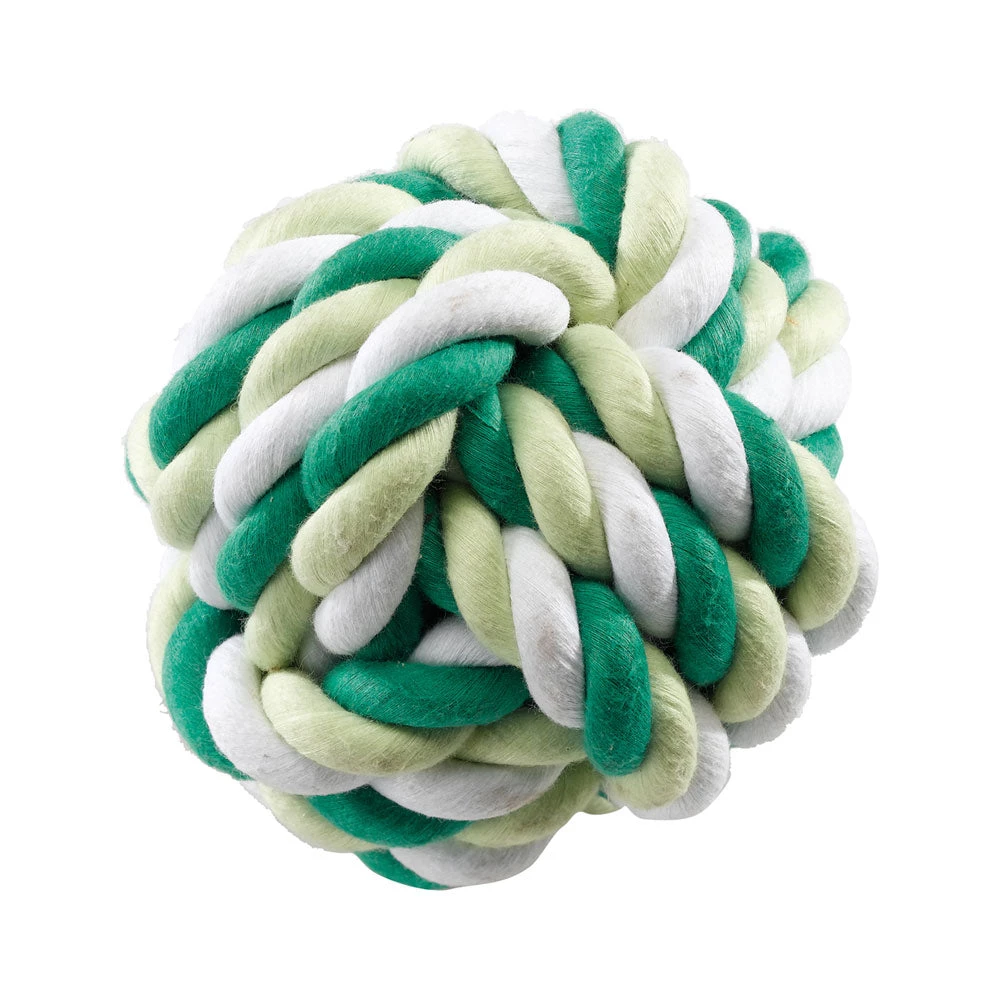 Hundeball aus gedrehter bunter Baumwollschnur in weiß, hell- und dunkelgrün. Eine gute Alternative zu herkömmlichem Hundespielzeug aus Gummi oder Latex.