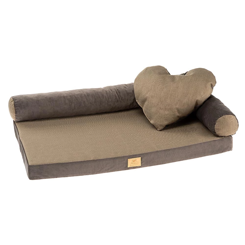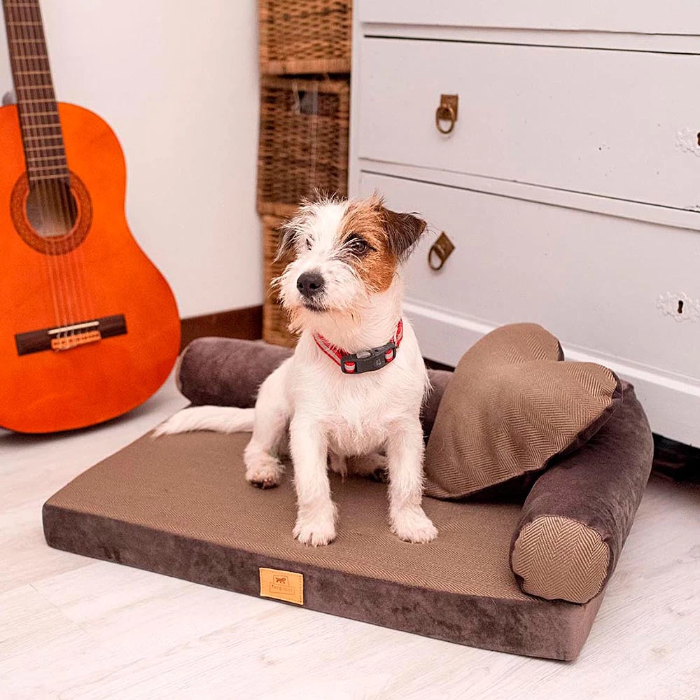 Hier schlagen wir das Hundesofa Tommy vor, das aus widerstandsfähigem Stoff mit Tweed-Effekt hergestellt und mit elegantem Samt verarbeitet ist. Super bequem für Hunde: Die Matratze hat eine dick gepolsterte Rückenlehne und ein zartes herzförmiges Kissen zum Kuscheln für Ihr Haustier. Das doppelseitige Kissen hat eine Seite aus Samt und eine aus widerstandsfähigem Stoff, beide passend zu denen des Sofas.