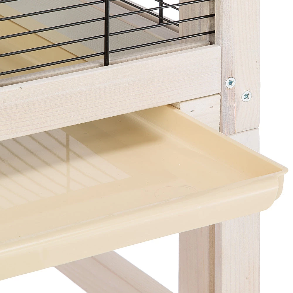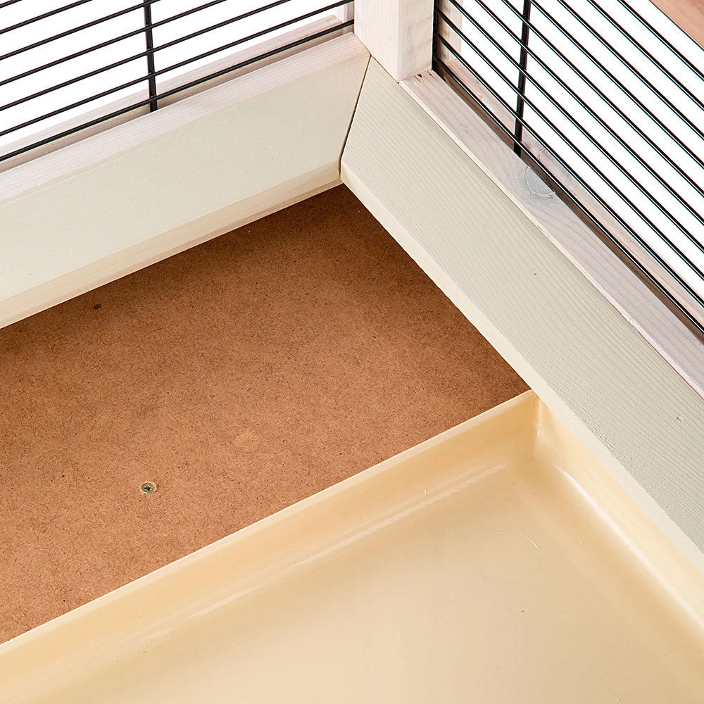 Am Boden ist der Käfig mit einer großen herausnehmbaren KunststofFSC™ hublade ausgestattet, die perfekt die Schmutz- und Speisereste auffängt und die ebenfalls mit einem Hakens blockiert werden kann. Für mehr Mobilität ist Wilma mit Rädern ausgestattet, und die ganze Volieren wird zerlegt in einem platzsparenden Paket geliefert.