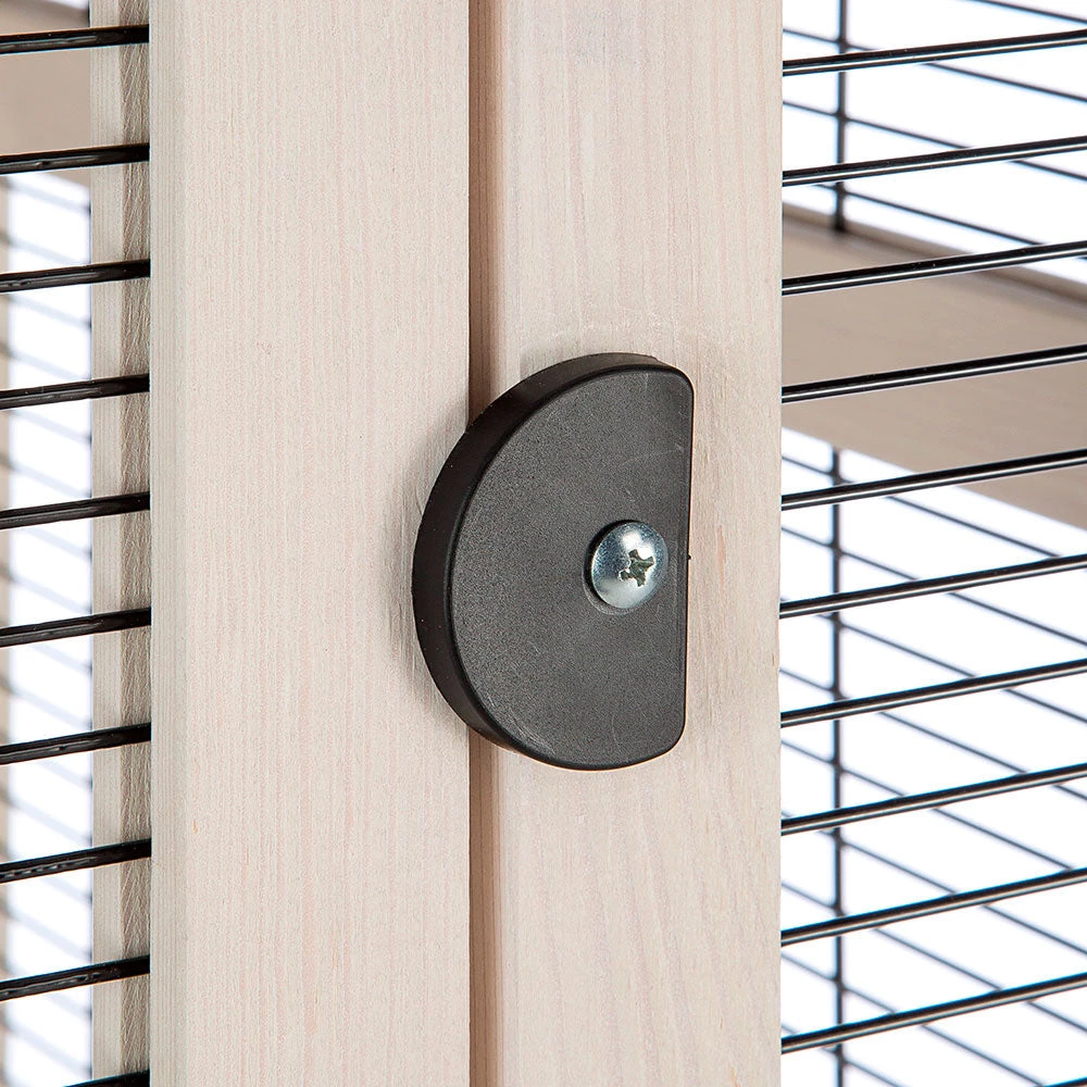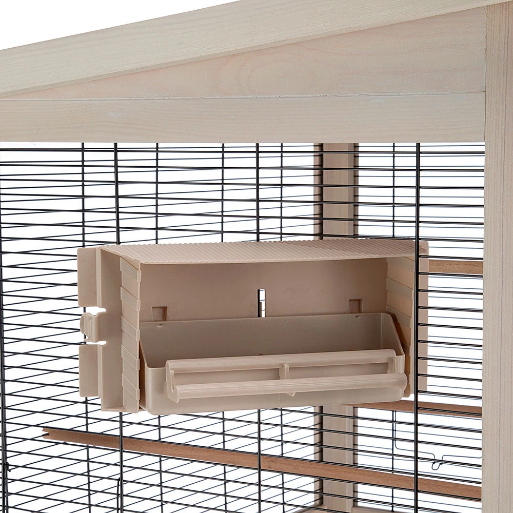 Die Voliere verfügt über eine große Fronttür, die mit einem Sicherheitsschließhaken verschlossen wird, und zwei Seitenklappen, die ebenfalls für die täglichen Wartungsarbeiten nützlich sind.