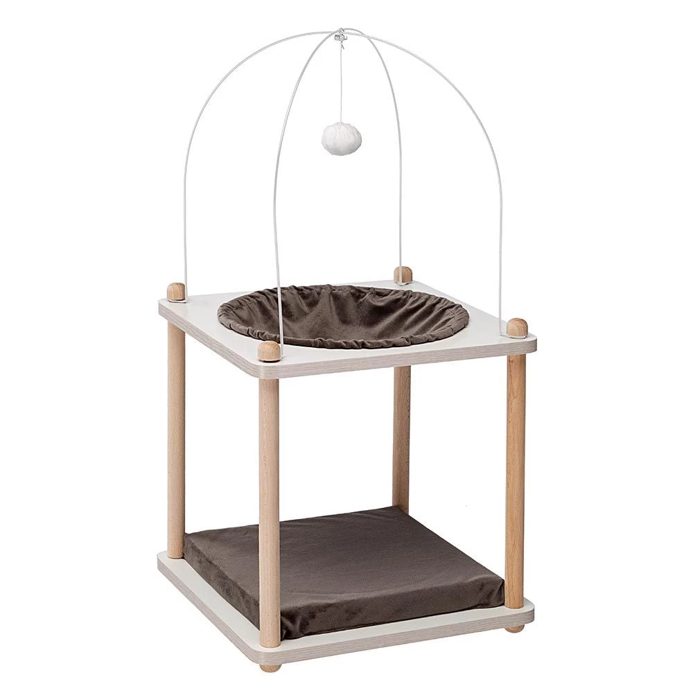 Die originellen Yoko-Katzenmöbel bestehen aus einer weichen Ruhezone, die von einer Art Kuppel bedeckt wird. Dadurch wird Ihre Mieze zum König des Hauses! Hier findet Ihr vierbeiniger Freund einen Ort, an dem er sich ausruhen oder aber auch spielen kann, denn über der Plattform mit Samtkissen im unteren Teil, befindet sich im oberen Teil eine weiche Hängematte, ebenfalls aus Samt, und darüber ein Pendelspiel mit einem Plüschball, den die Katze wegschwingen und wieder fangen kann: Freizeitspaß garantiert! Außerdem ermöglicht Yoko es dem Tier auch, die Umgebung zu überwachen und alles unter Kontrolle zu halten, denn die untere Etage ist nach allen Seiten offen und bietet einen vollständigen Rundumblick.
